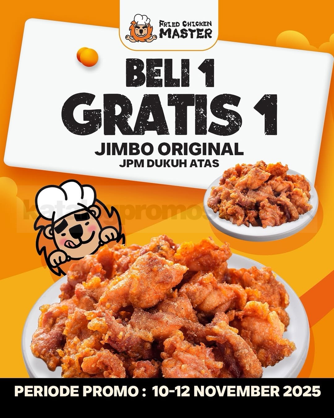 Promo Fried Chicken Master Opening Beli 1 Gratis 1 Jimbo Original nikmati lezatnya ayam renyah + berlaku 10โ12 November 2025 di JPM Dukuh Atas.