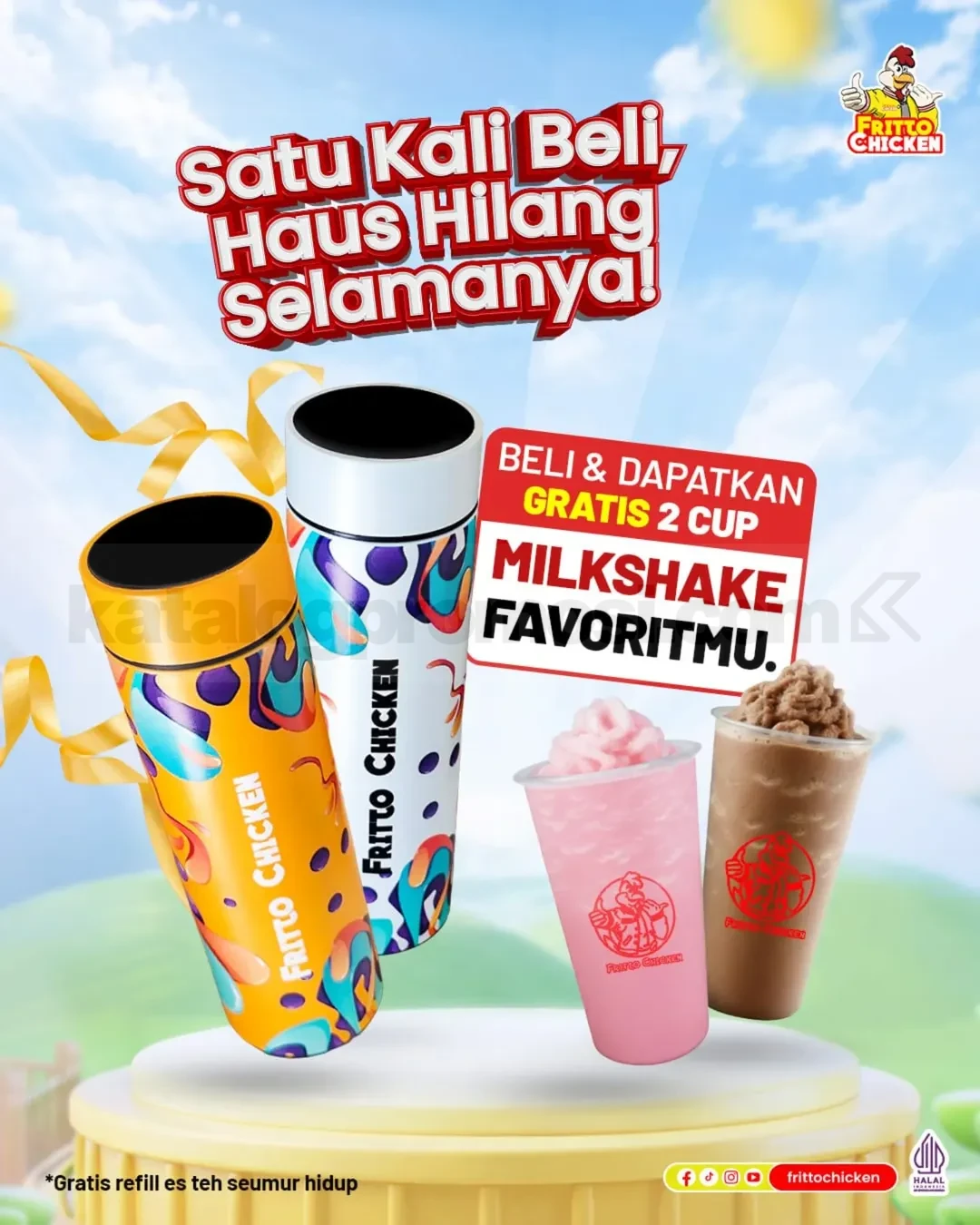 Kalau kamu sering mampir ke Fritto Chicken, promo ini jelas sayang banget dilewatkan. Sekali beli tumbler, kamu bisa nikmatin refill es teh berkali-kali plus bonus milkshake di awal. Yuk langsung amankan sebelum kehabisan! 🥤🔥