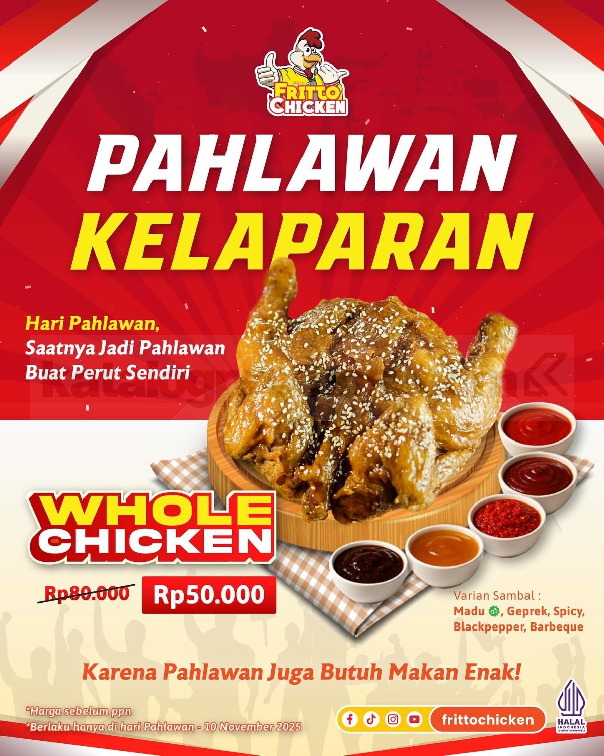 Yuk, rayakan Hari Pahlawan dengan cara paling lezat — manfaatkan Promo Fritto Chicken Hari Pahlawan Whole Chicken cuma Rp.50.000 dan nikmati sensasi ayam gurih, renyah, dan penuh rasa yang siap bikin harimu makin semangat! 🍗🔥