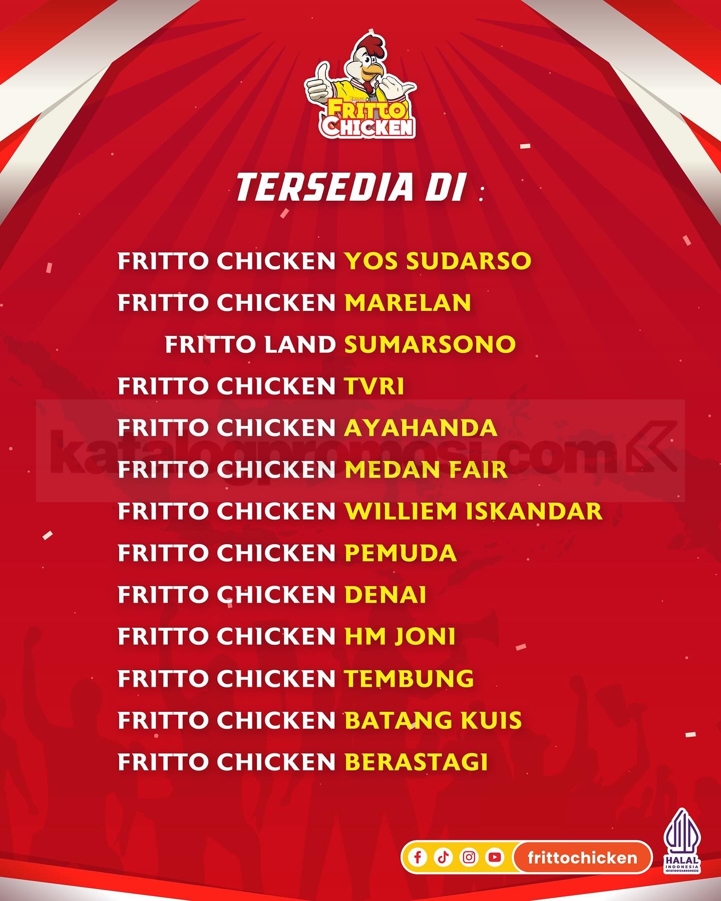 A: Promo berlaku di outlet Fritto Chicken: Yos Sudarso, Marelan, Sumarsono, TVRI, Ayahanda Medan Fair, Williem Iskandar, Pemuda, Denai, HM Joni, Tembung, Batang Kuis, dan Berastagi.