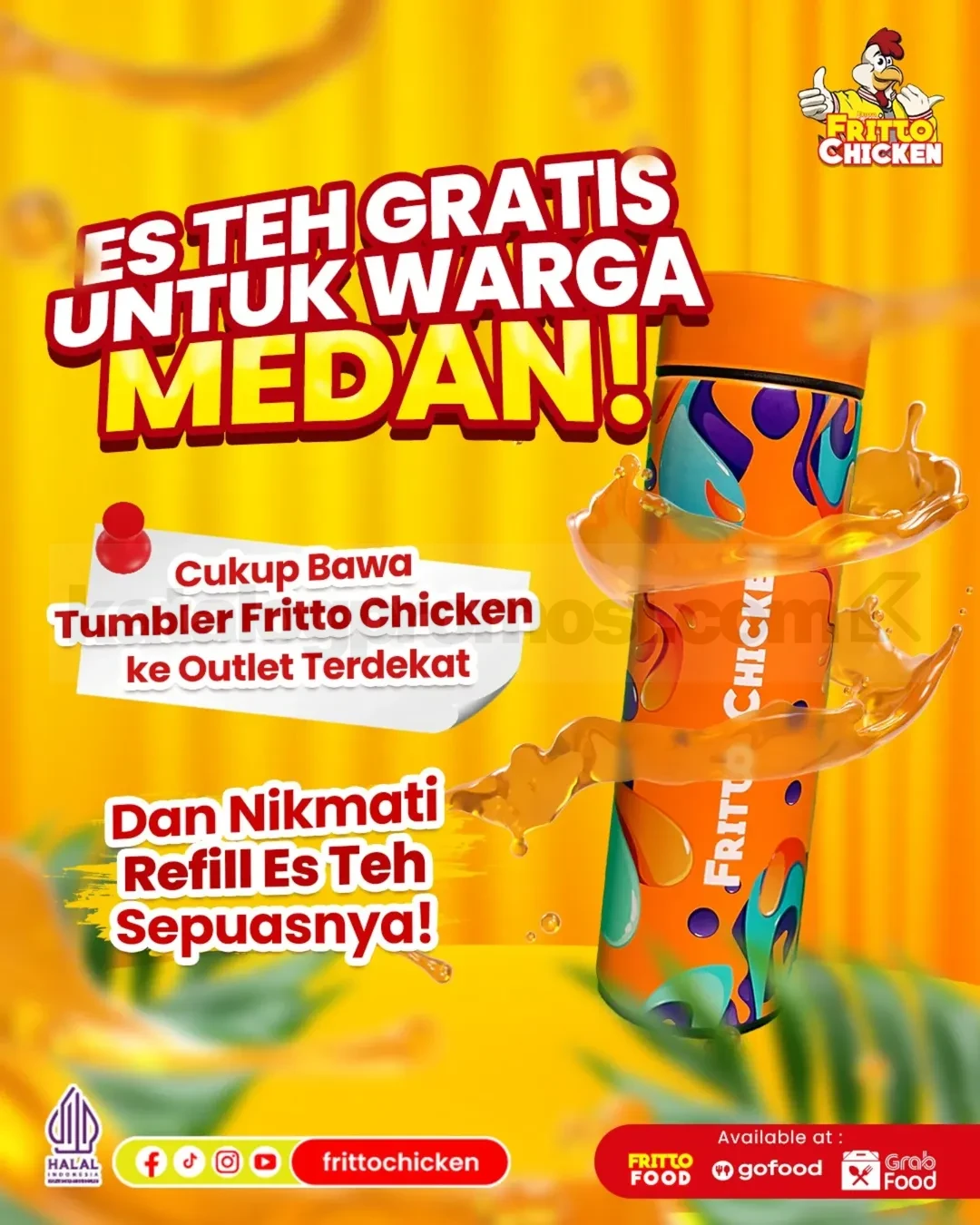 Segerin harimu tanpa batas! 🧡 Bawa tumbler Fritto Chicken ke outlet terdekat di Medan dan nikmati refill es teh sepuasnya.