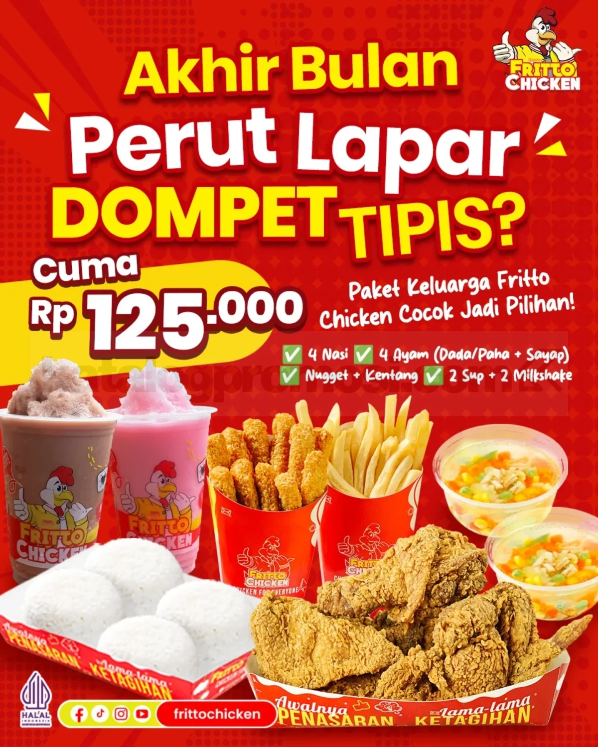 Promo Fritto Chicken Paket Super Irit 5 Ayam Rp75.000. Pesan sekarang di Aplikasi Fritto Food, GoFood, GrabFood, atau ShopeeFood!