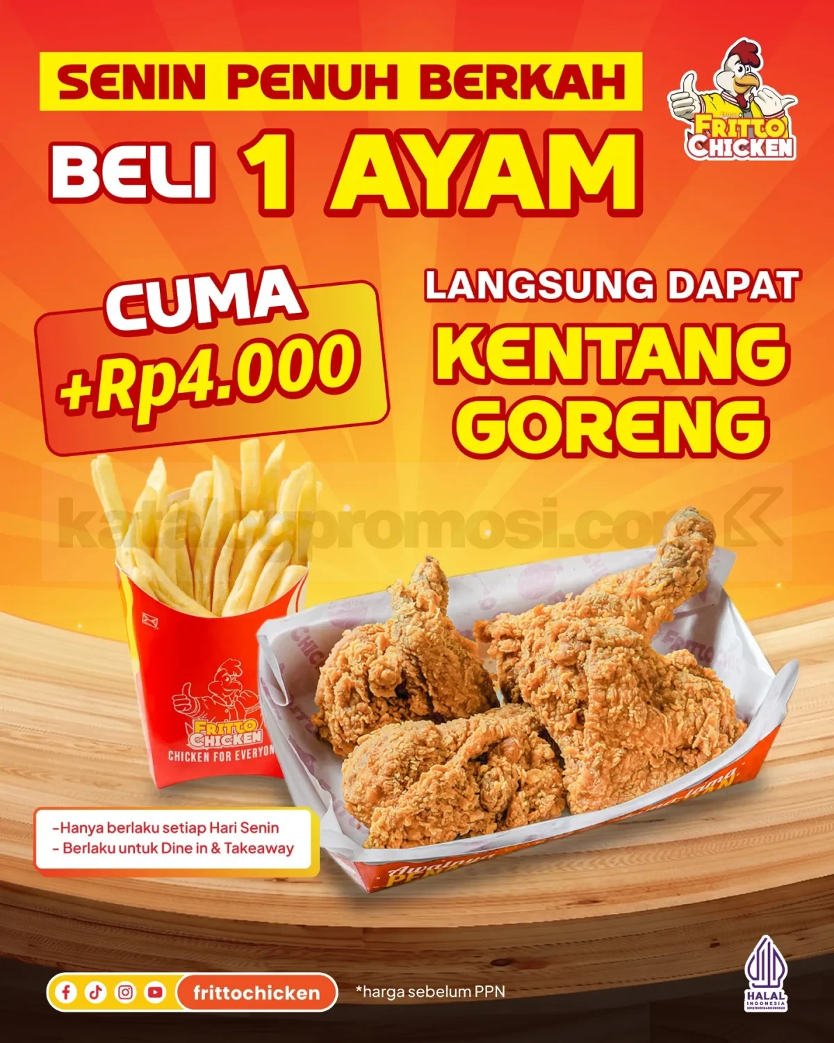 Pembelian 1 ayam dapat tambahan kentang goreng cukup dengan menambah Rp.4.000 sesuai ketentuan promo yang berlaku setiap hari Senin.