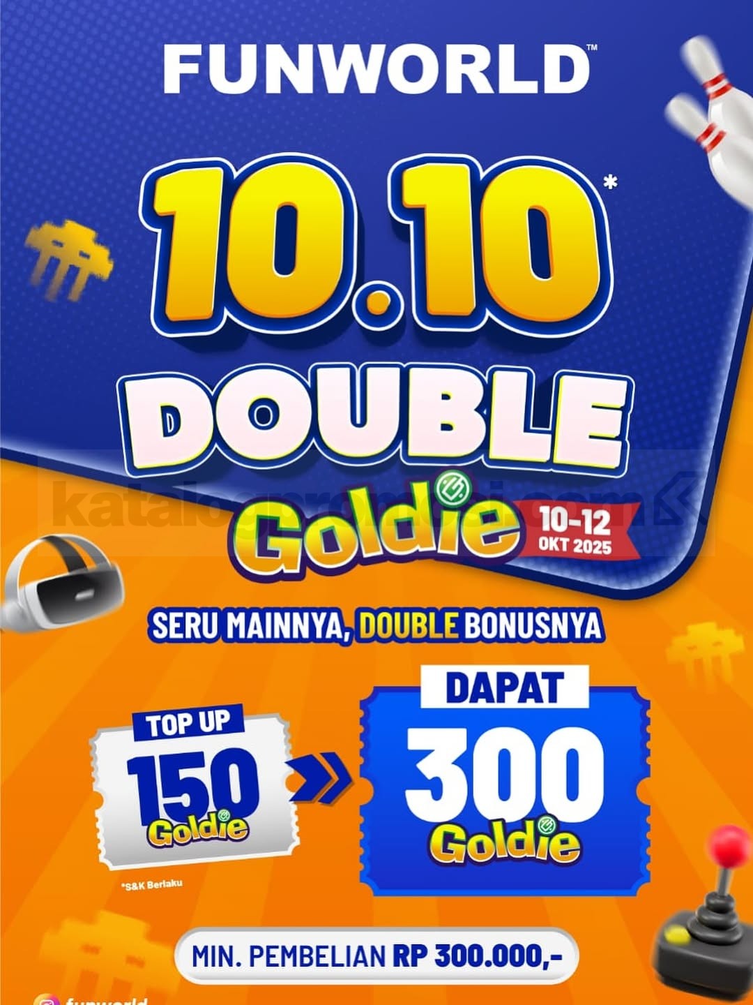 Main di Funworld makin seru karena bonusnya dobel! Ajak teman, keluarga, atau pasangan buat nikmatin wahana favorit kamu dan kumpulin Goldie sebanyak-banyaknya selama tanggal 10.10 ini. 🎠🎯