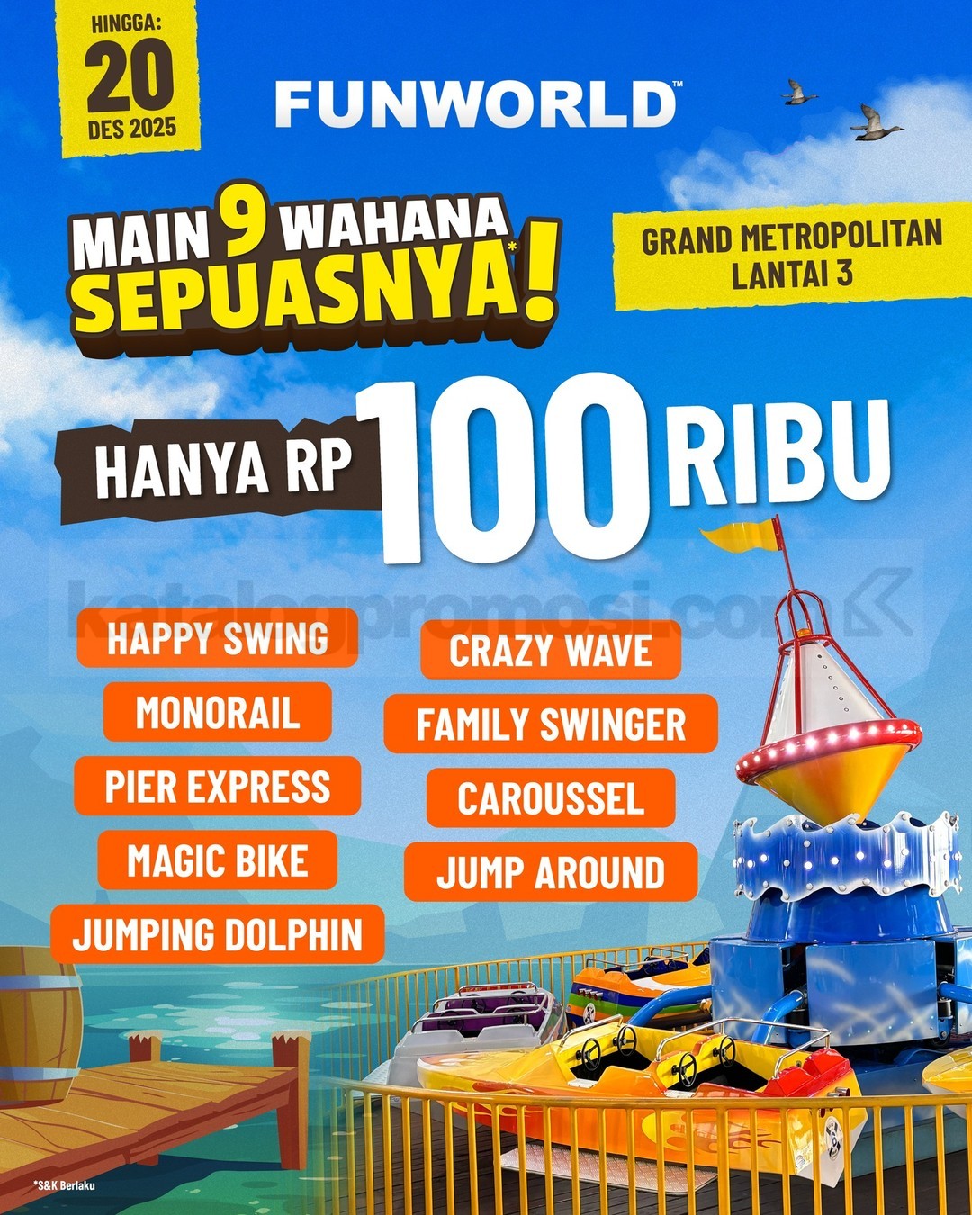 Promo Funworld The Pier Main 9 Wahana Rp.100.000 dengan mekanisme follow akun dan tukar di kasir, berlaku 20 November 2025 – 20 Desember 2025 di Grand Metropolitan Bekasi.