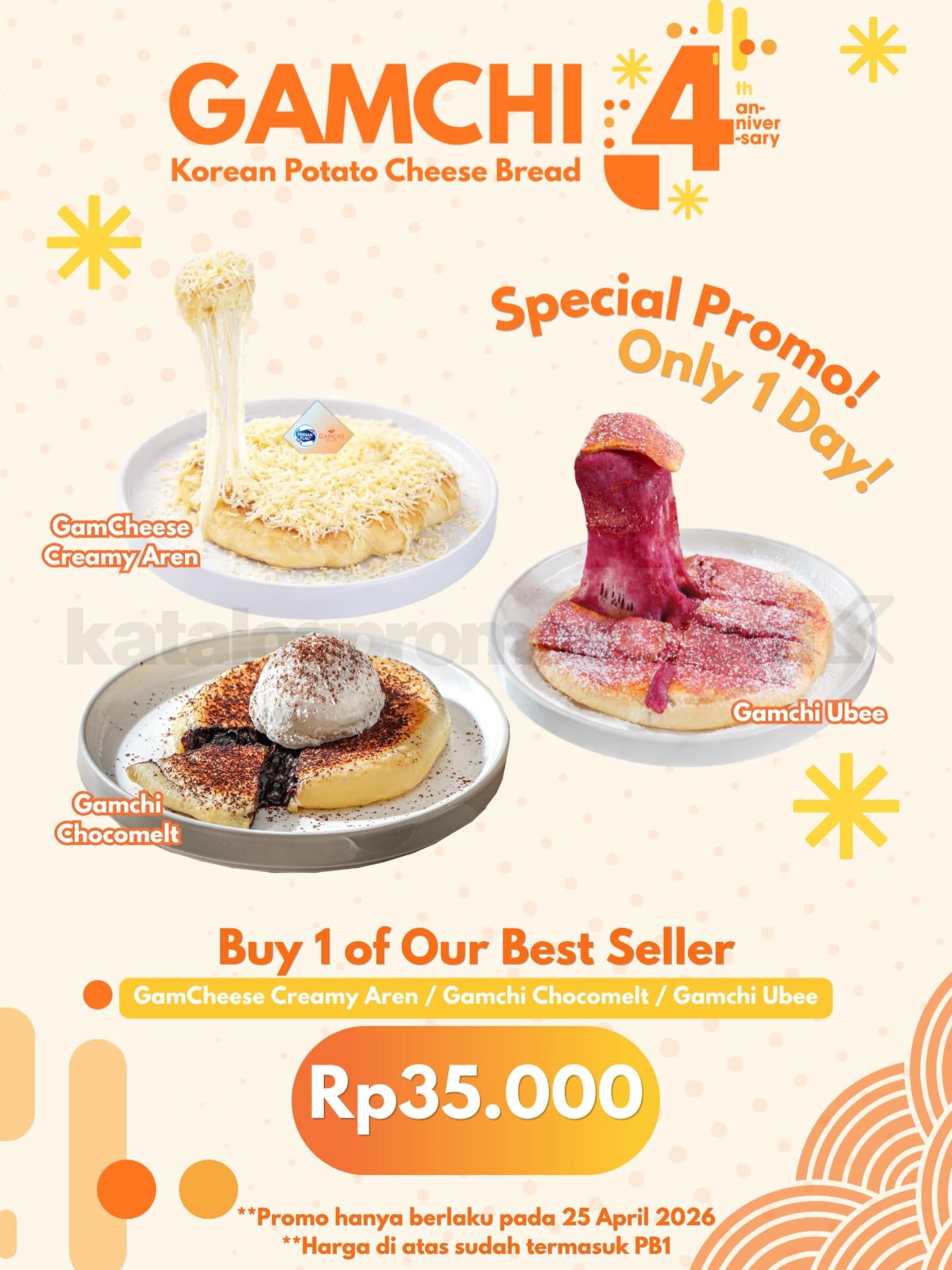 Promo Gamchi Anniversary Menu Favorit Rp. 35.000 berlaku hanya 1 hari tanggal 25 April 2026 di seluruh outlet Gamchi sesuai periode program anniversary.
