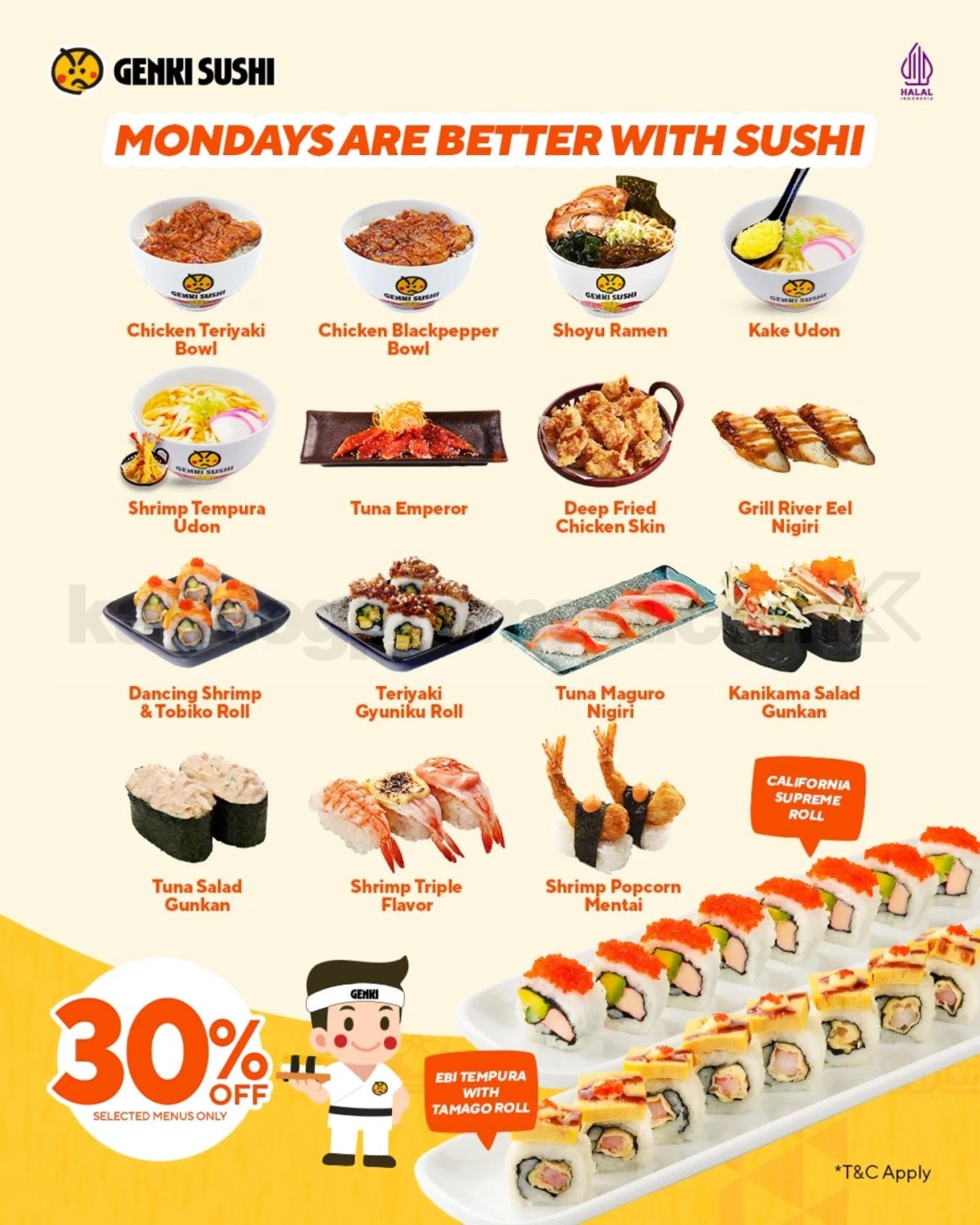 Lewat promo ini, kamu bisa nikmatin diskon 30% untuk selected menu di Genki Sushi. Pilihannya cukup beragam, mulai dari menu ringan sampai menu yang lebih ngenyangin, jadi bisa disesuaikan sama mood dan selera makan hari Senin.