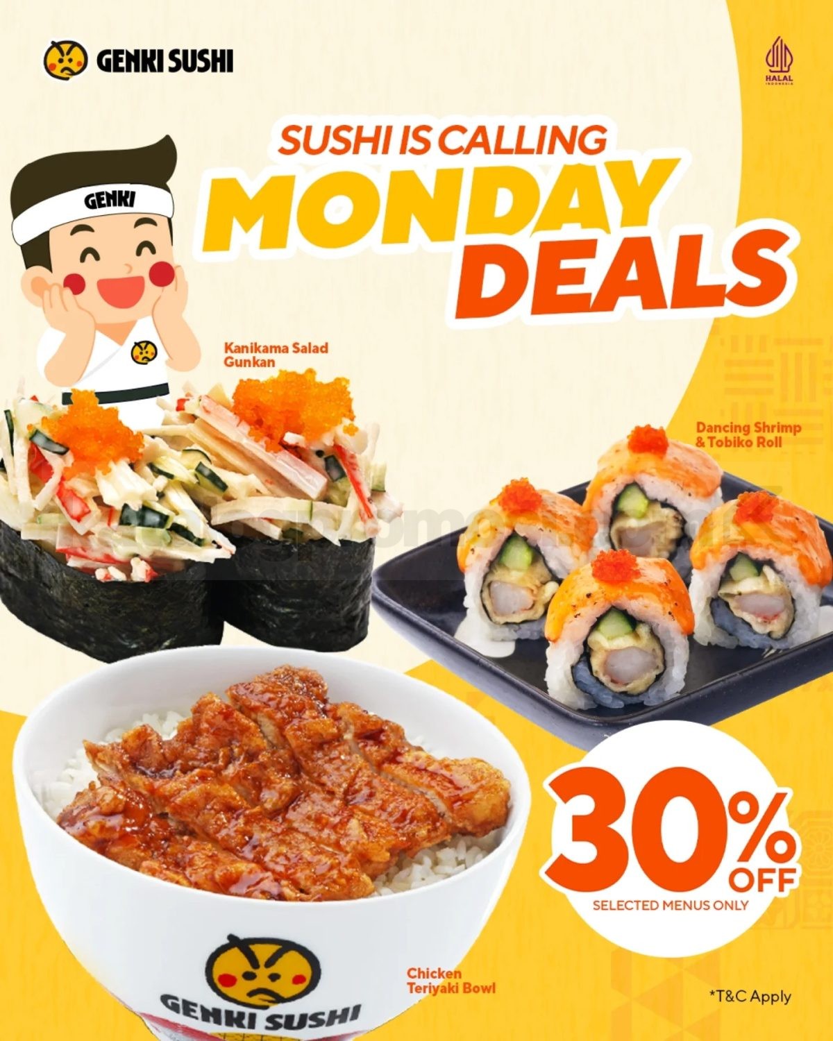 Promo Genki Sushi Monday Deals diskon 30% untuk selected menu berlaku setiap hari Senin hingga 23 Februari 2026 di outlet Genki Sushi