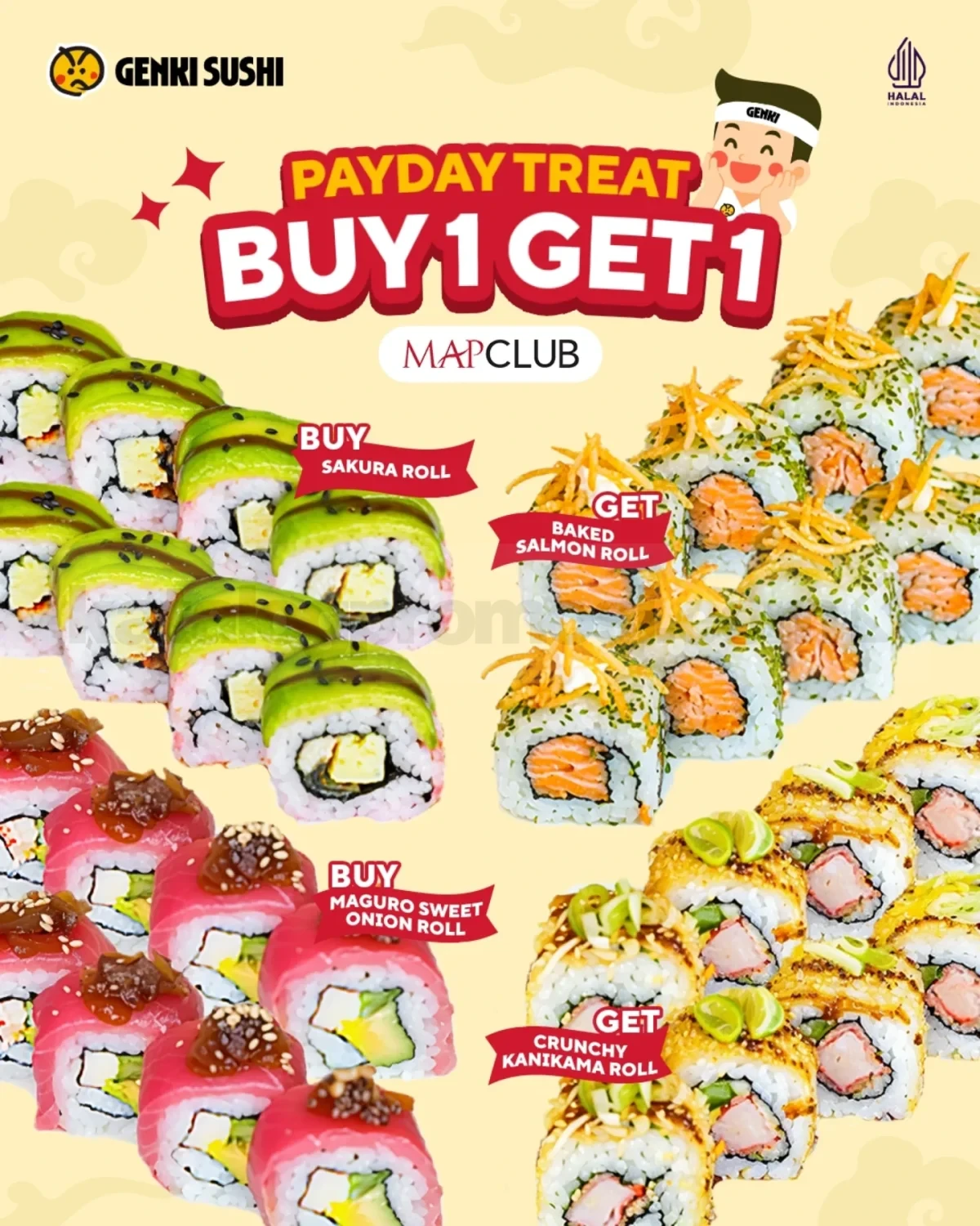 Promo Genki Sushi Payday Treat Buy 1 Get 1 Sushi Roll pilihan via MAPCLUB berlaku mulai tanggal selama periode payday berlangsung di outlet tertentu.