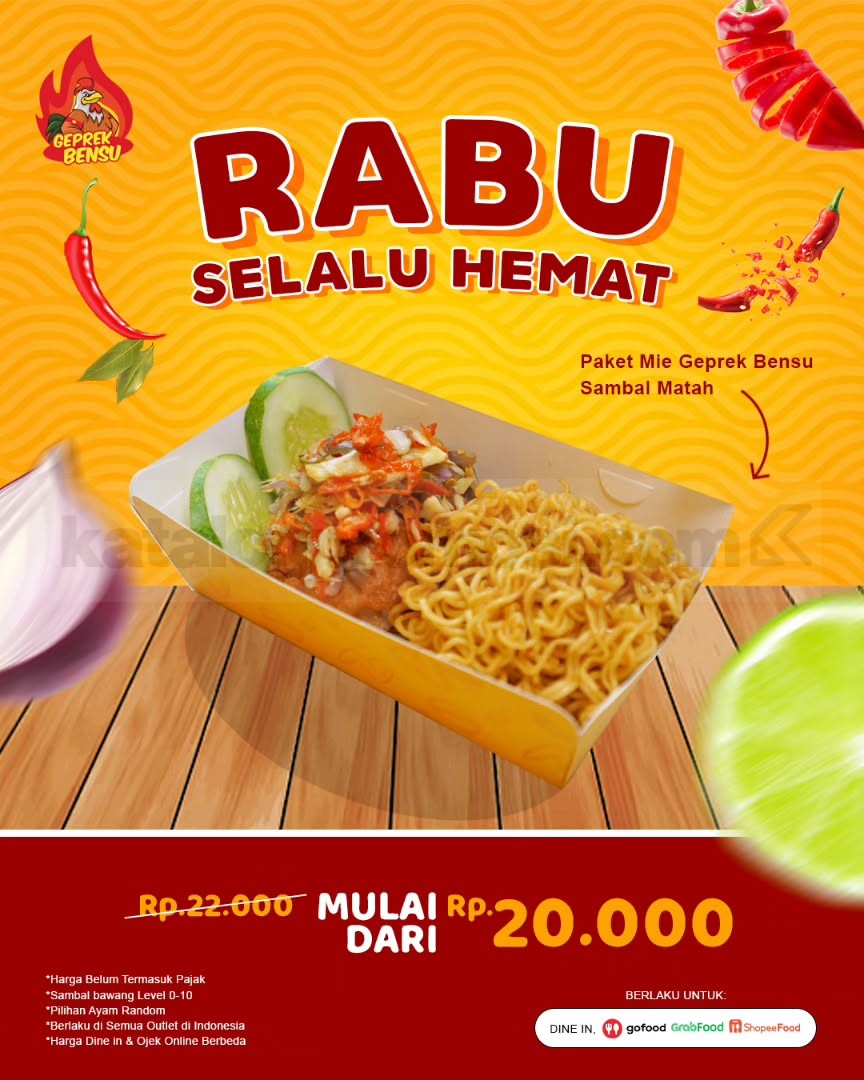 Promo Geprek Bensu Rabu Selalu Hemat mulai Rp. 20.000, nikmati paket mie sambal matah dengan ayam random, berlaku dine in, take away, dan pesan online.