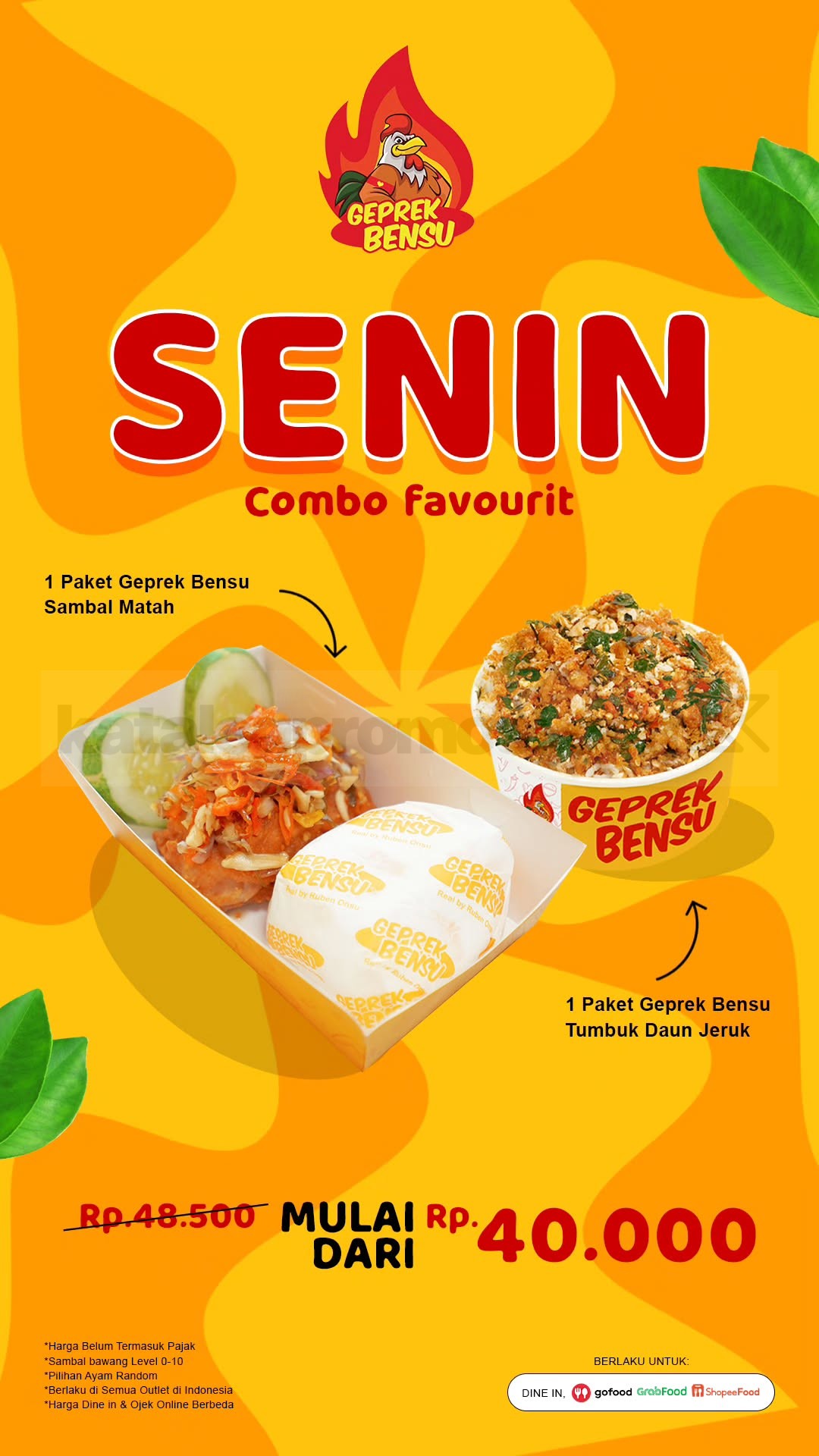 ๐ Cek gambar Promo Geprek Bensu Senin Combo Favourit Rp.40.000 di bawah ini untuk lihat paket lengkap dan sensasi pedas gurihnya!