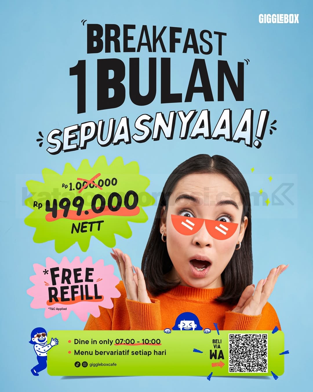 Jangan tunggu lama, segera dapatkan Breakfast Card GiggleBox dan nikmati sarapan free refill sepuasnya Rp.499.000 setiap pagi bareng teman atau keluarga! 🥐☕