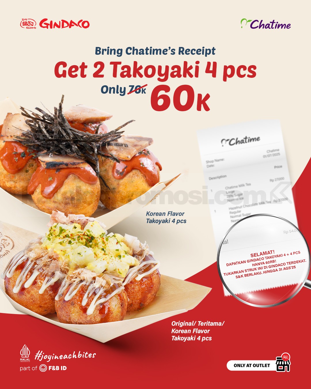 Cuma dengan tunjukin struk pembelian minuman di Chatime, kamu bisa dapetin 2 porsi Takoyaki isi 4 pcs dari Gindaco cuma seharga 60K aja. Gak pake ribet, gak pake kode, tinggal tunjukin struk kamu dan langsung nikmatin cemilan gurih yang ngegigit ๐ฅ