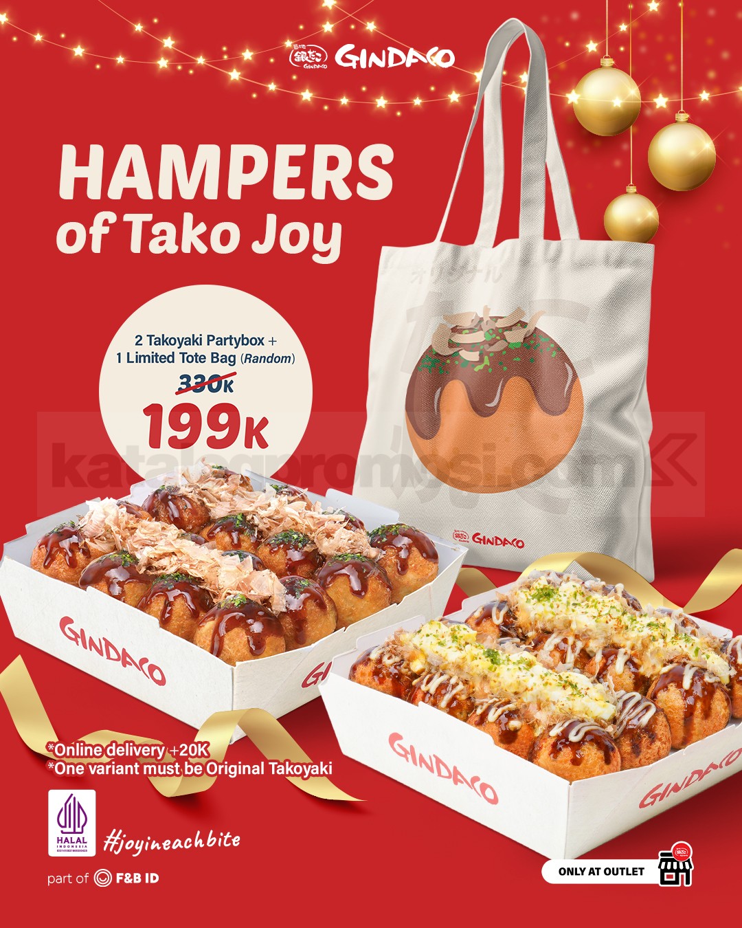 Promo Gindaco Hampers of Tako Joy Only 199K*, Hmapers berisi 2 Takoyaki Partybox dan 1 Limited Tote Bag.
