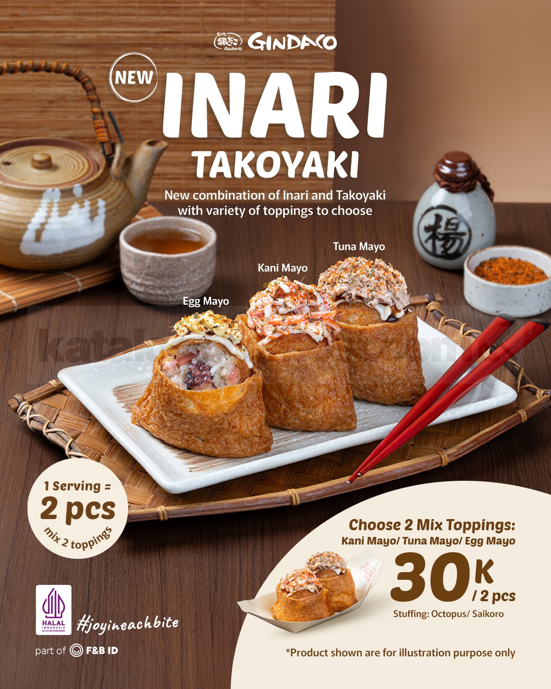Promo Gindaco NEW MENU! INARI TAKOYAKI Start From 30K*, tersedia di seluruh store Gindaco.