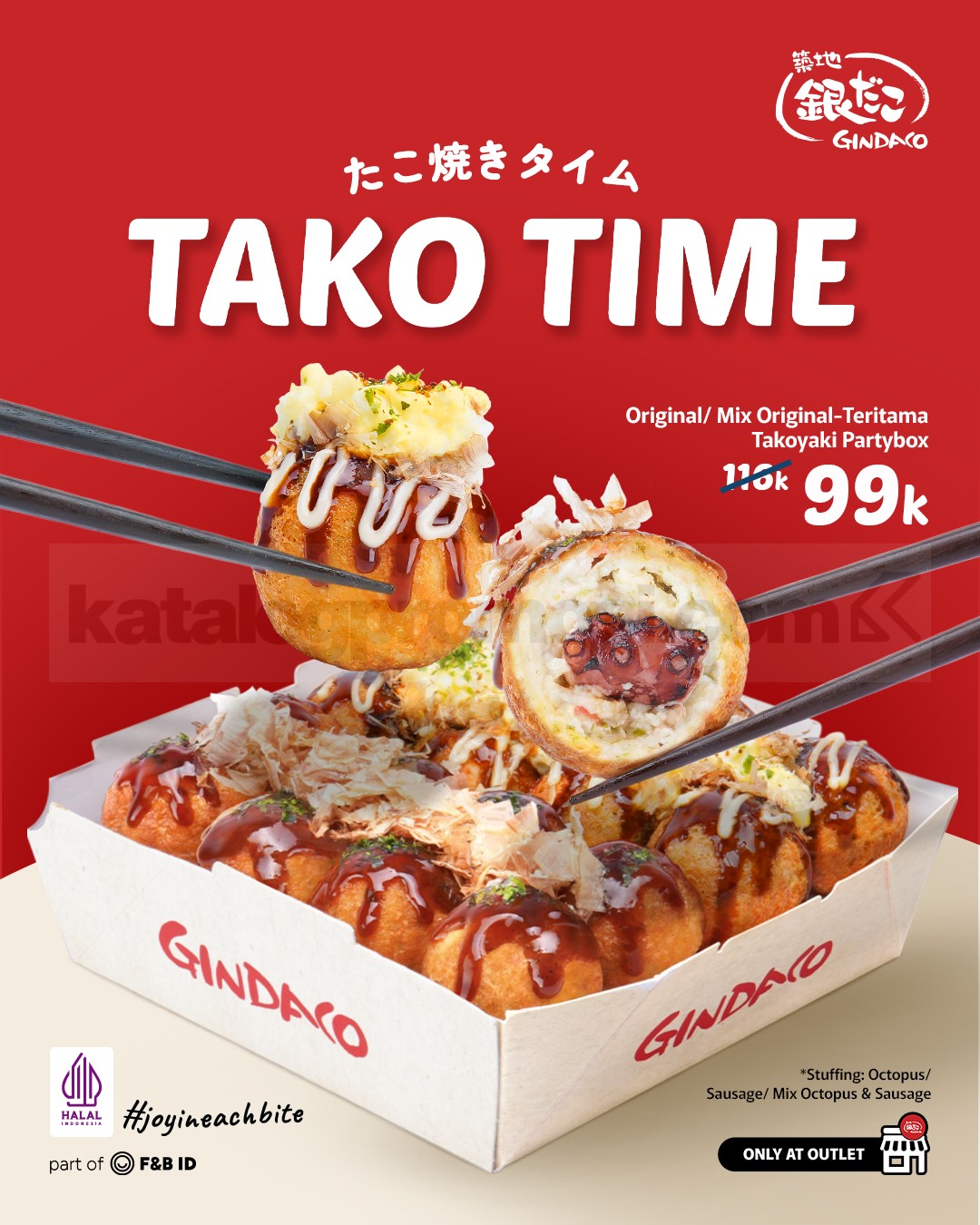 Promo Gindaco TAKO TIME Partybox Cuma Rp. 99.000 pilihan takoyaki original dan mix berlaku selama periode promo di outlet tertentu