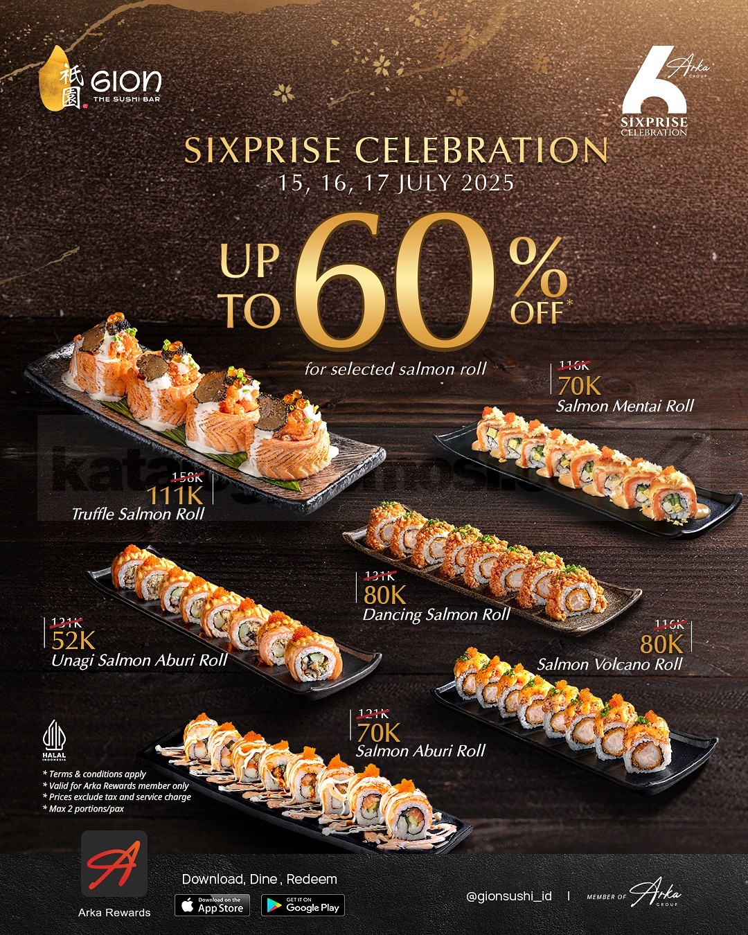 Promo Gion Sushi Arka Anniversary diskon hingga 60% untuk 6 menu sushi roll pilihan, 15–17 Juli 2025! Khusus member Arka Rewards, dine-in only.