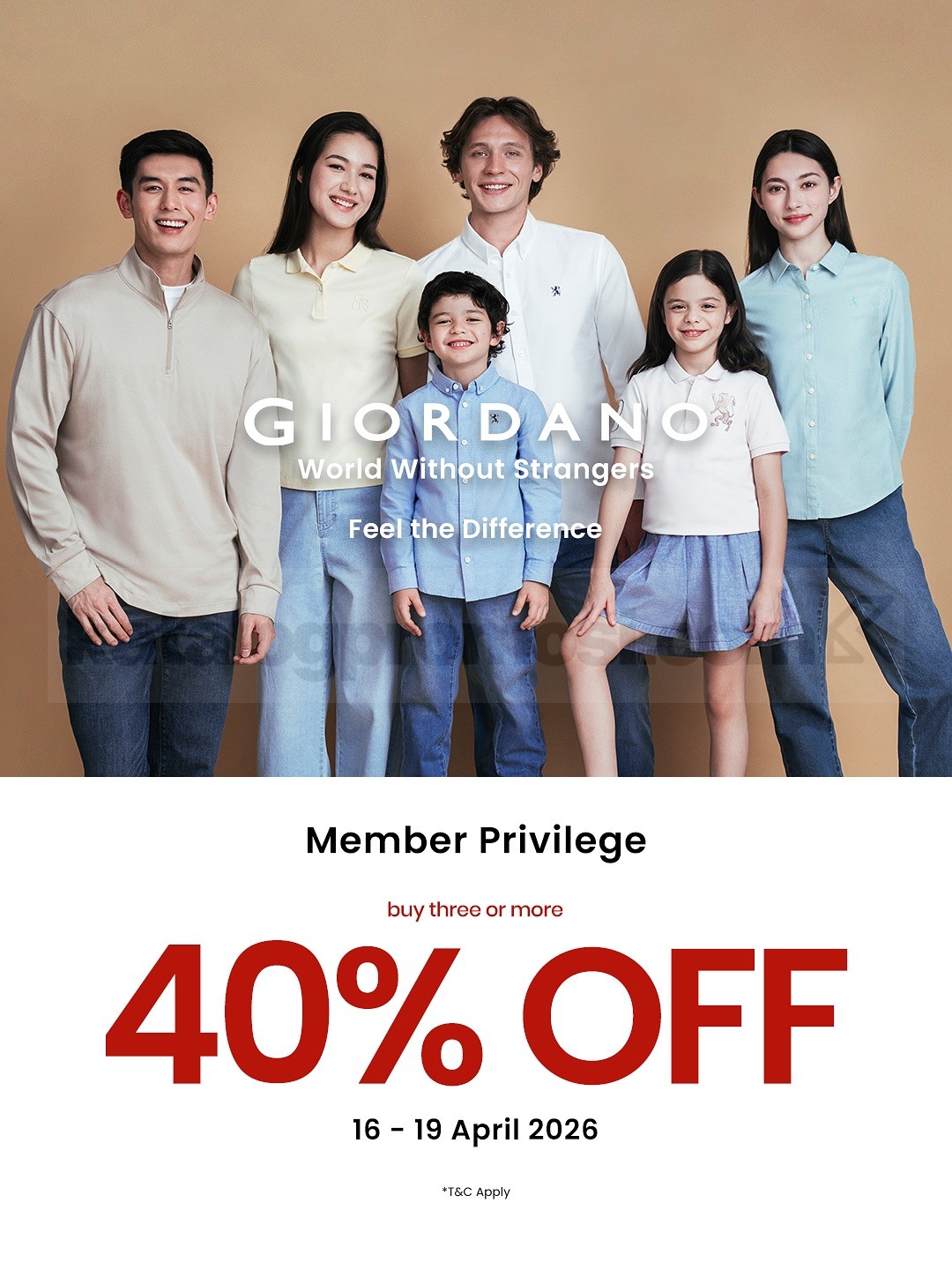 Promo Giordano Beli 3 Produk Diskon 40% Khusus Member nikmati potongan harga untuk pembelian minimal 3 item berlaku mulai tanggal 16 April 2026 – 19 April 2026 di store tertentu