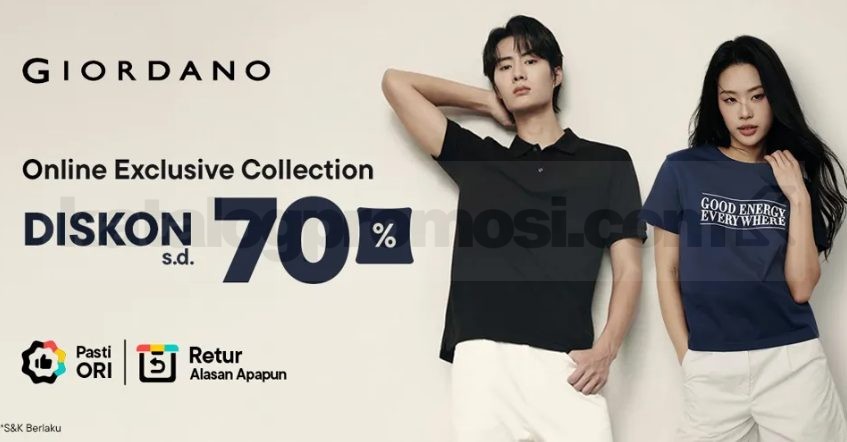 - Diskon hingga 70% tersedia untuk koleksi tertentu di Giordano Flagship Store