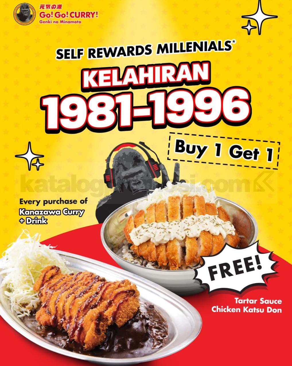 Promo Go! Go! CURRY Beli 1 Gratis 1 berlaku 13–15 Oktober 2025 untuk Millennials 1981–1996. Beli Kanazawa Curry Medium, gratis Tartar Sauce Chicken Katsu Don!