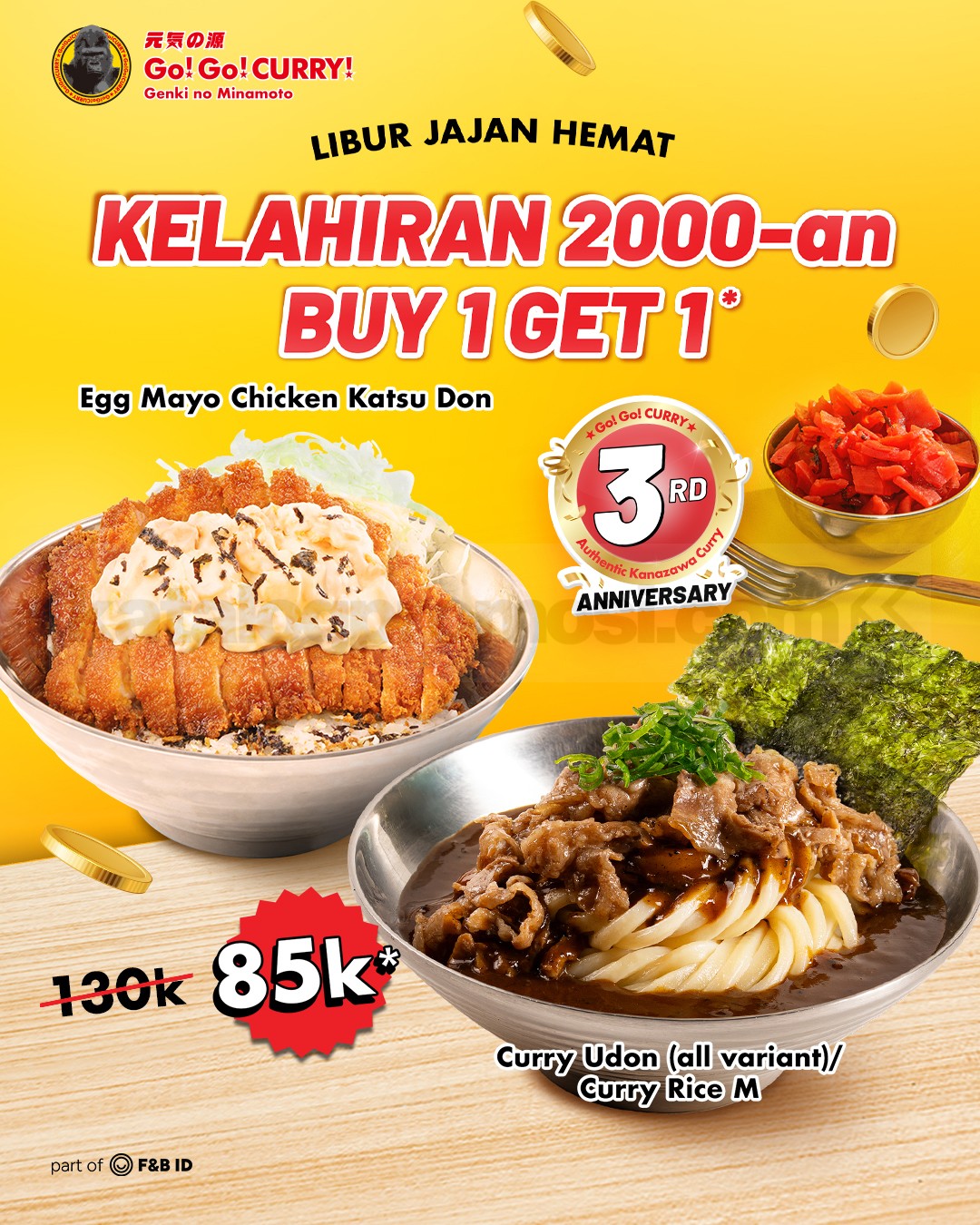 Lewat promo ini, kamu yang lahir di era 2000-an bisa menikmati menu curry favorit dengan benefit tambahan tanpa biaya ekstra. Cukup pesan Curry Udon semua varian atau Curry Rice ukuran M, lalu kamu akan mendapatkan Egg Mayo Chicken Katsu Don sebagai menu bonus yang langsung bisa dinikmati di satu meja. nostalgia nongkrong bareng teman, atau sekadar cari alasan buat makan bareng keluarga di akhir tahun. 🍛💛