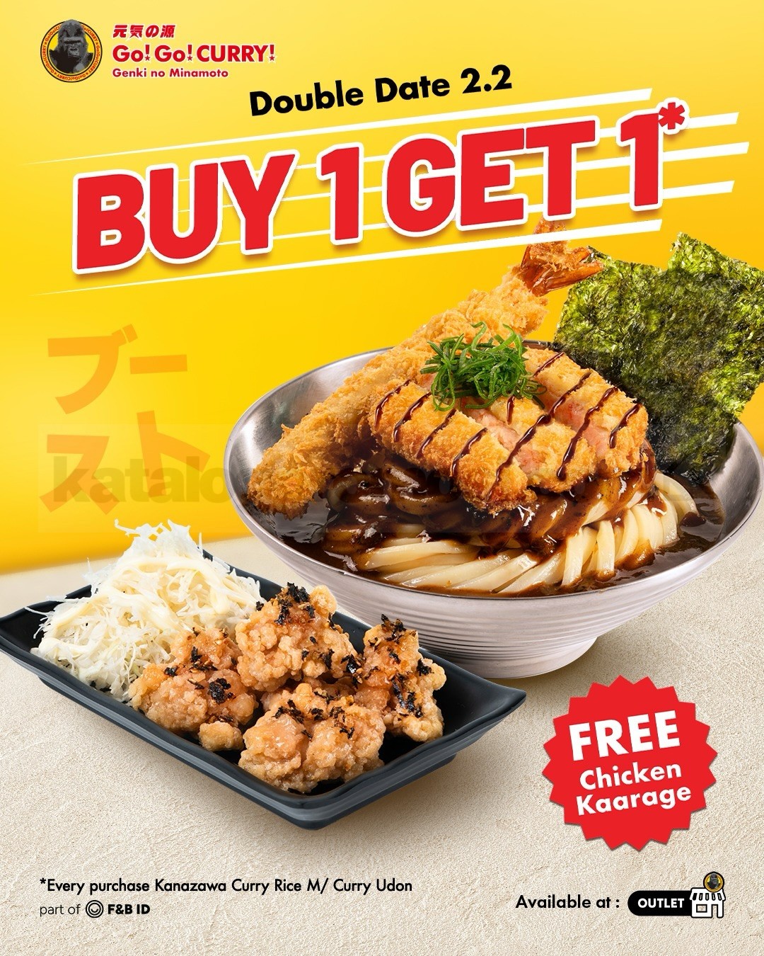 Promo Go! Go! CURRY Double Date 2.2 Gratis Chicken Karaage dengan pembelian Kanazawa Curry Rice M atau Curry Udon, berlaku mulai tanggal 2 Februari 2026 – 6 Februari 2026 di seluruh outlet.