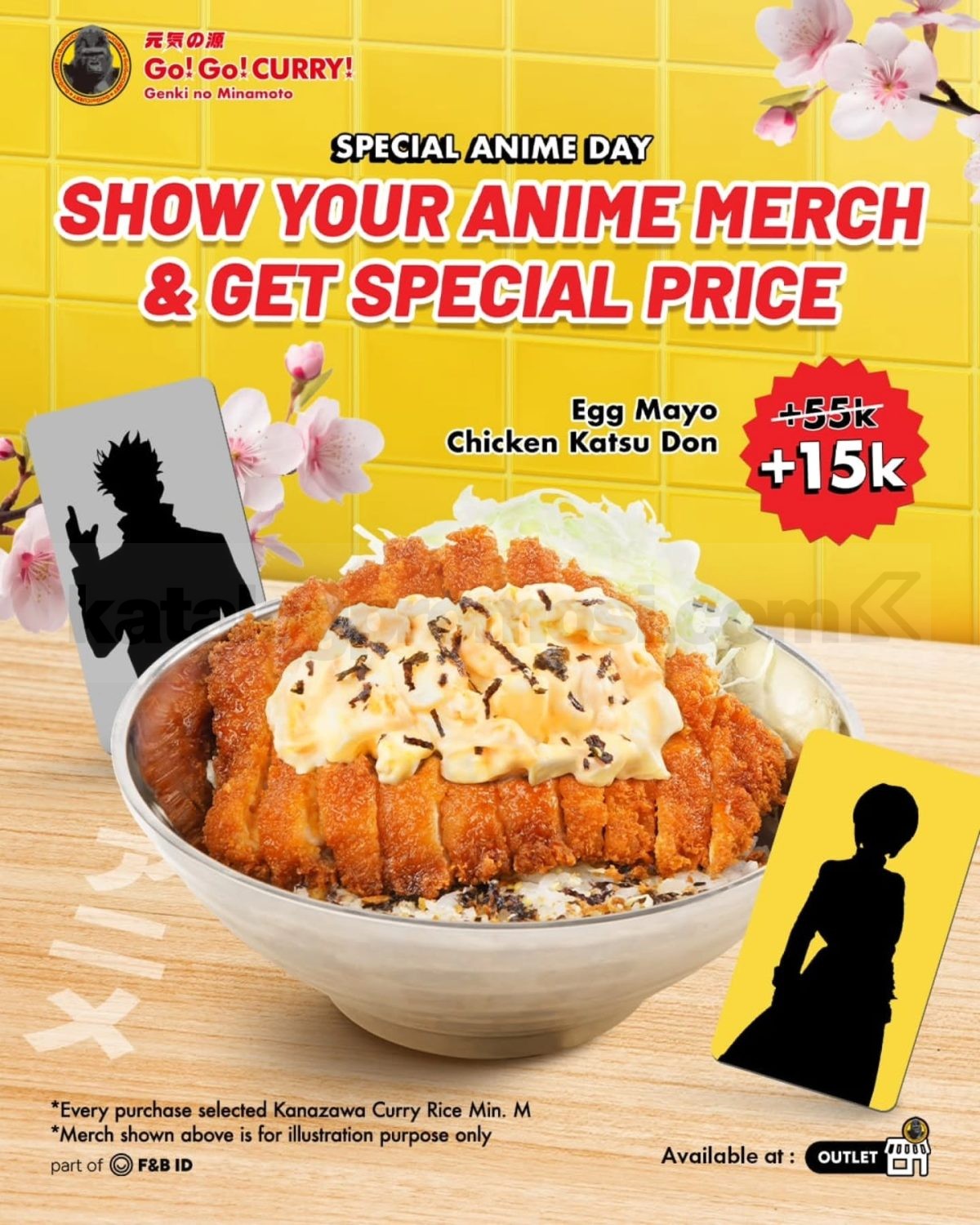 Promo Go Go Curry Special Price Egg Mayo Chicken Katsu Don Rp. 15.000 jadi momen seru buat kamu yang ingin menikmati menu Jepang favorit dengan cara yang beda. Dengan menunjukkan anime merch yang kamu punya, kamu bisa mendapatkan Egg Mayo Chicken Katsu Don dengan tambahan harga Rp. 15.000 🤩