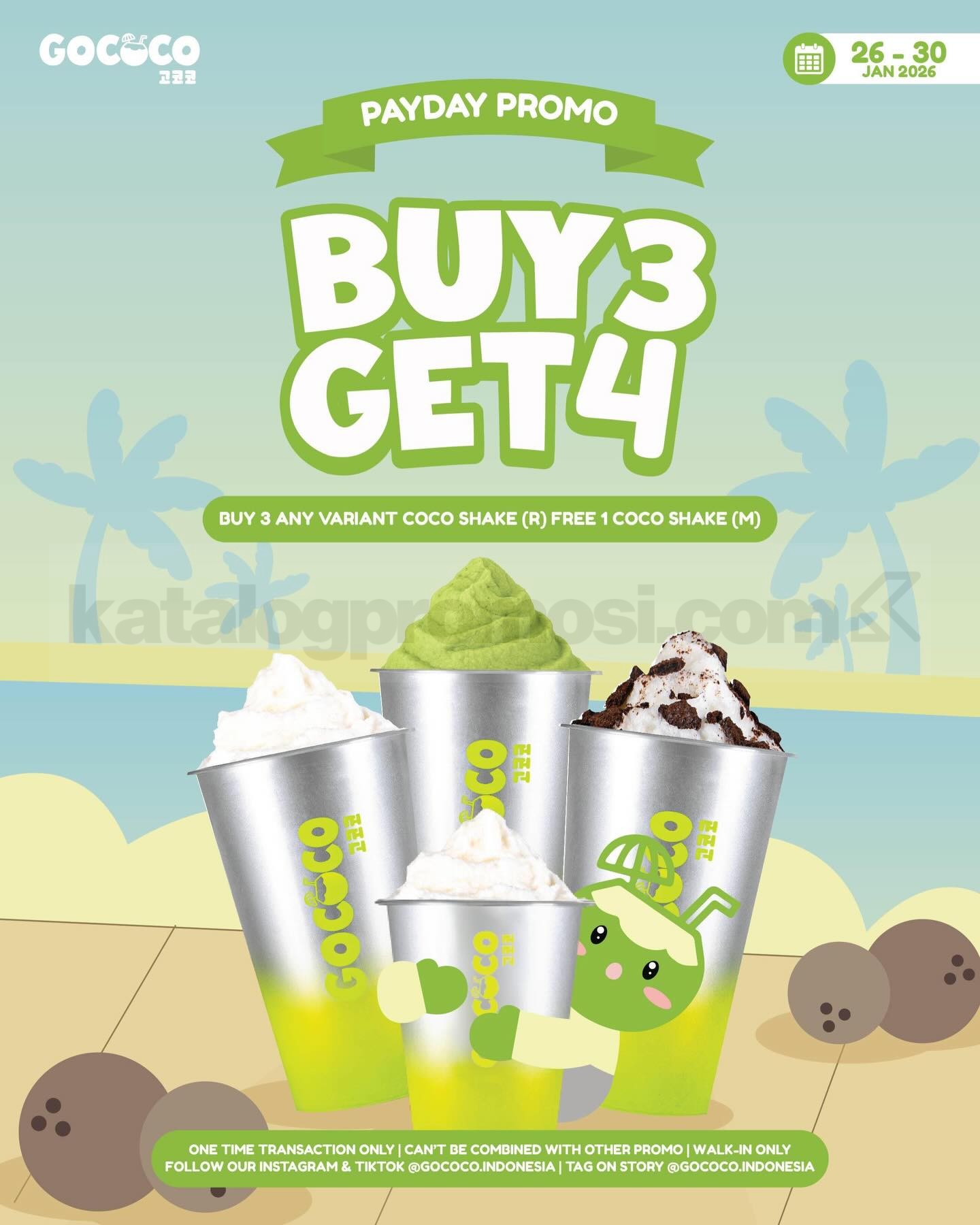 Promo Gococo Payday Buy 3 Get 4 Coco Shake dengan beli 3 Coco Shake ukuran R gratis 1 Coco Shake ukuran M, berlaku mulai tanggal 26-30 Januari 2026 di outlet Gococo tertentu.