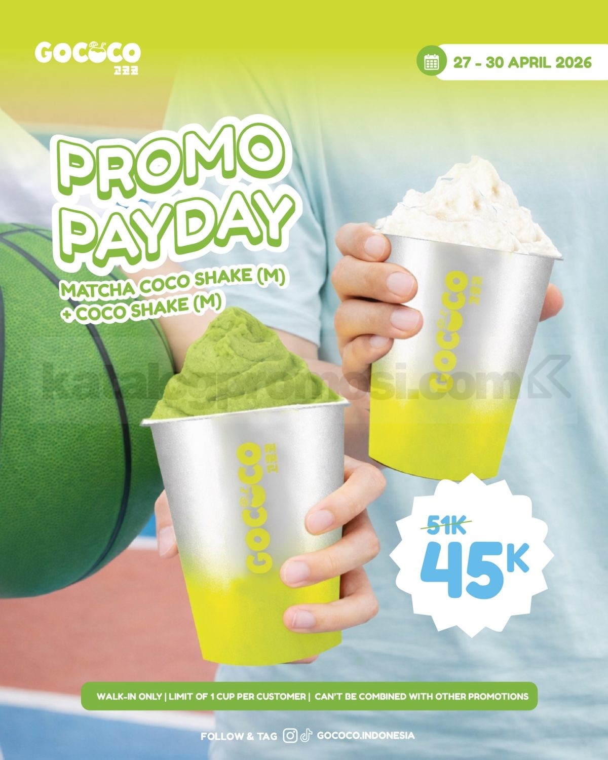 Promo GOCOCO Payday Combo 2 Minuman Rp. 45.000 hemat untuk Coco Shake dan Matcha Coco Shake, paket spesial berlaku mulai tanggal 27 April 2026 – 30 April 2026 di seluruh outlet.