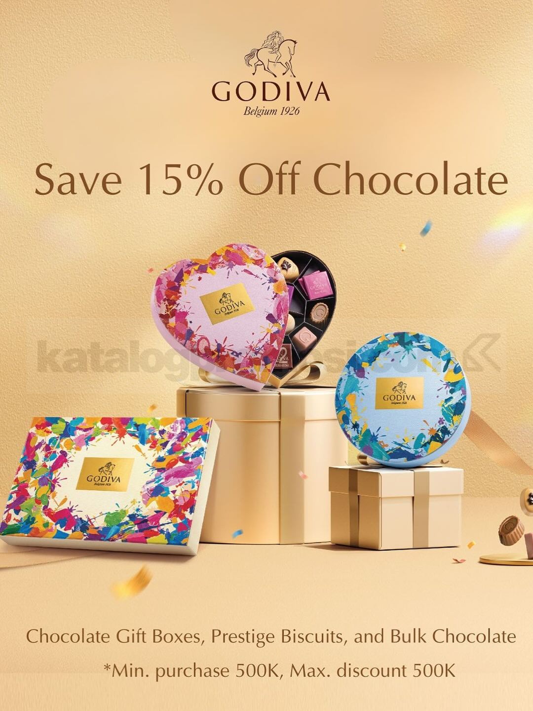 - Diskon 15% berlaku untuk Chocolate Gift Boxes, Prestige Biscuits, dan Bulk Chocolate