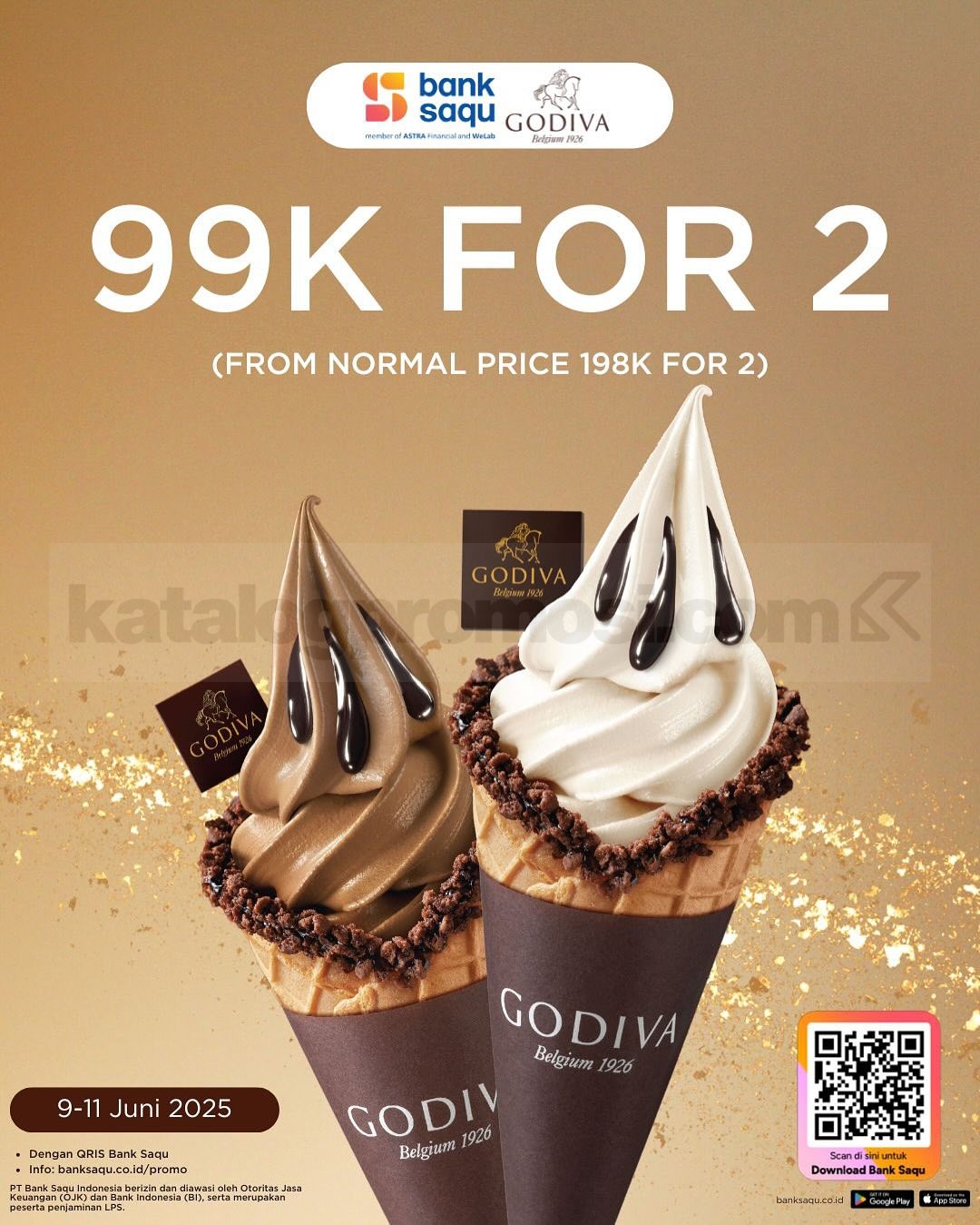 Promo Godiva x Bank Saqu cuma 3 hari! Bayar pakai QRIS Bank Saqu dan nikmati 2 cone es krim cuma Rp99.000 aja, dari harga normal Rp198.000!
