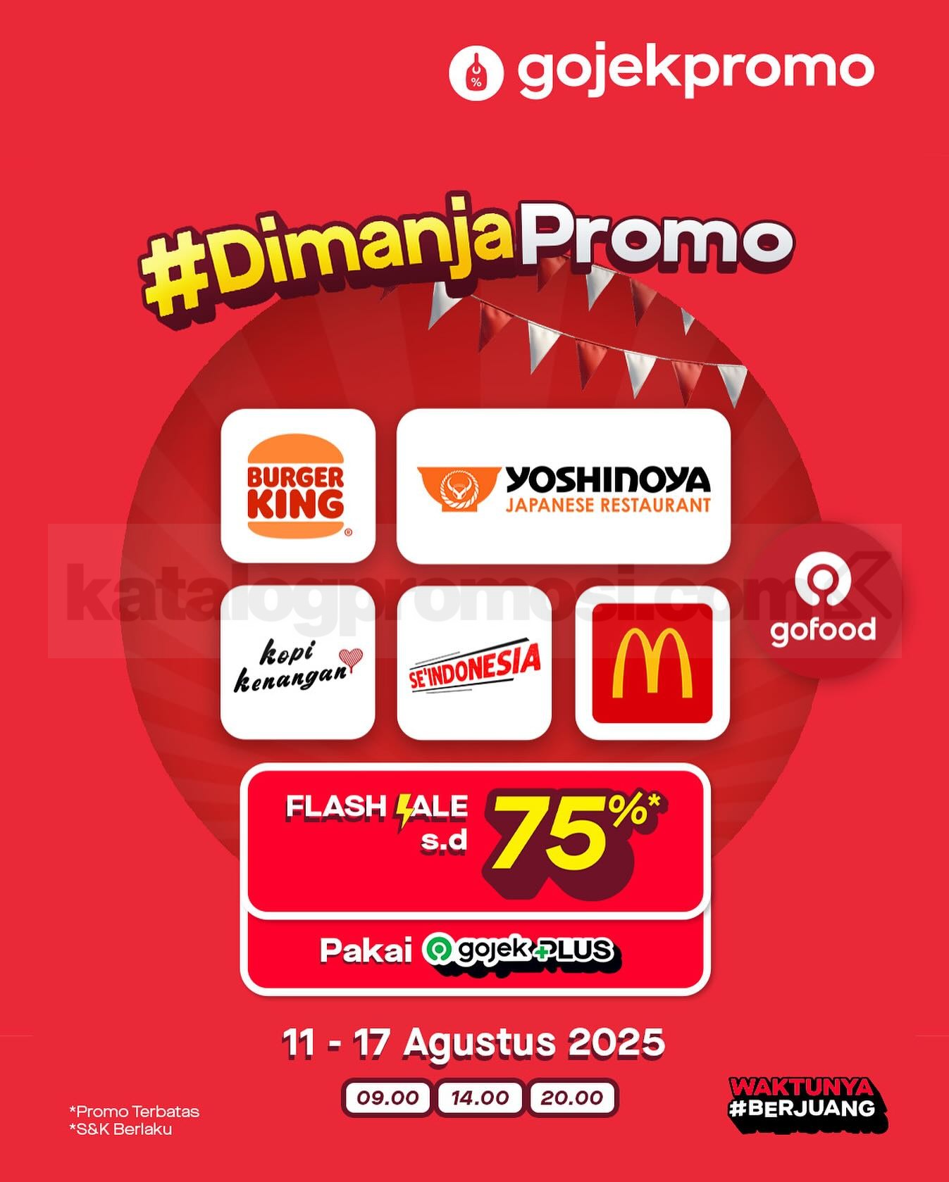 Promo Gojek #DimanjaPromo GoFood flash sale hingga 75% untuk pengguna Gojek Plus, berlaku mulai tanggal 11–17 Agustus 2025.