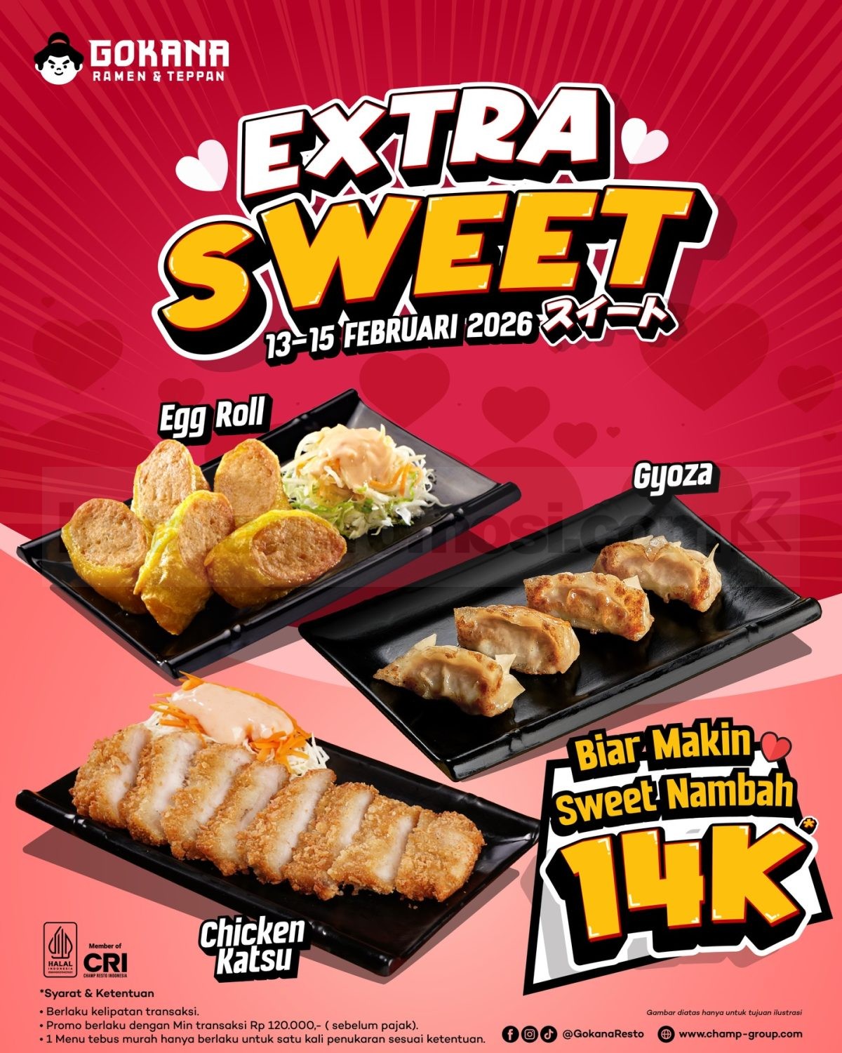 Promo Gokana Extra Sweet Side Dish Rp. 14.000 untuk Gyoza, Egg Roll, dan Chicken Katsu dengan min. transaksi Rp120.000 berlaku mulai tanggal 13-15 Februari 2026 di seluruh outlet.