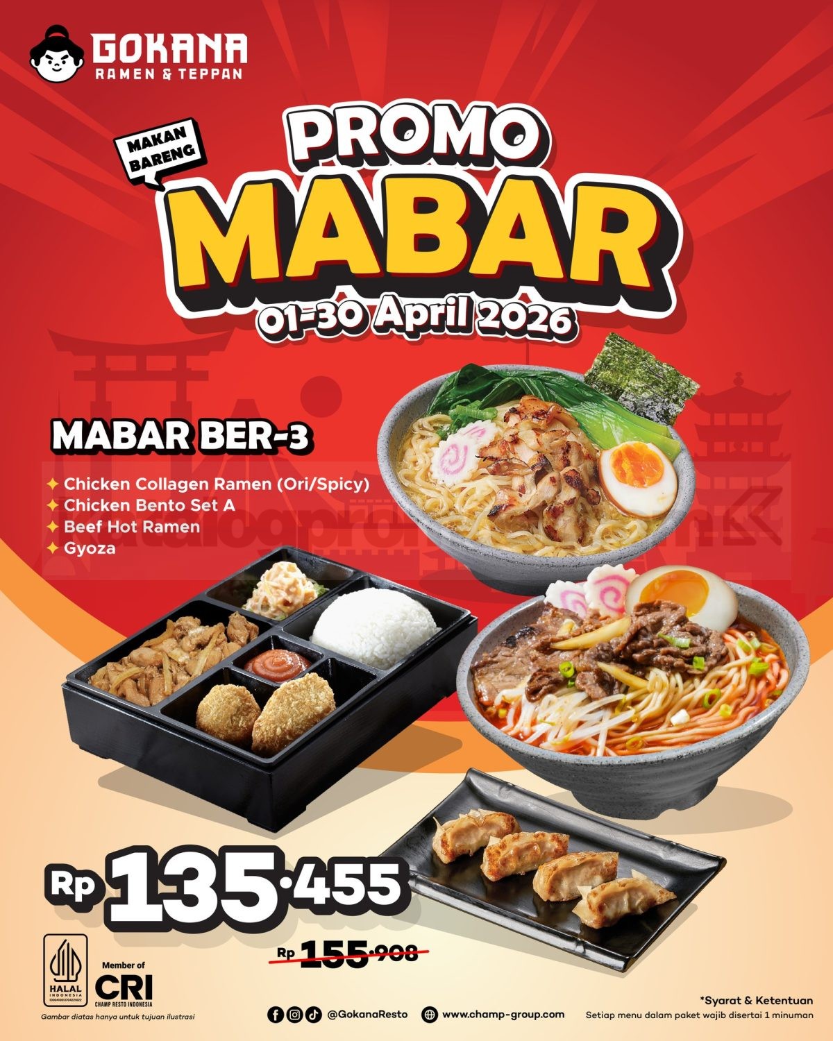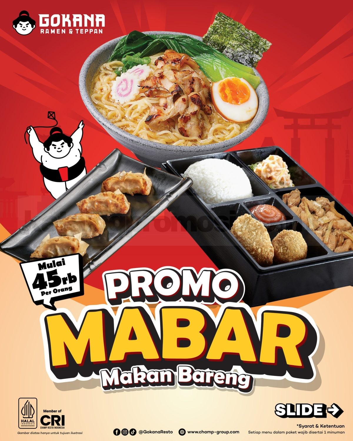 Promo Gokana Makan Bareng mulai Rp. 45.000 per orang dengan pilihan ramen, teppan, dan bento dalam paket hemat berlaku mulai tanggal 1 April 2026 – 30 April 2026.