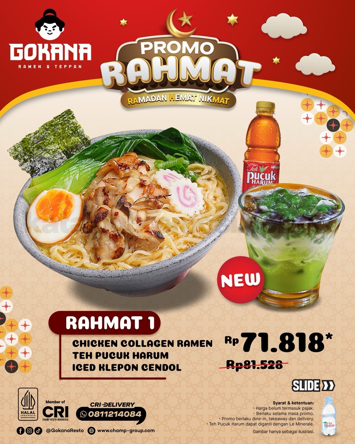β’ RAHMAT 1 seharga Rp. 71.818* berisi Chicken Collagen Ramen, Teh Pucuk Harum, dan Iced Klepon Cendol