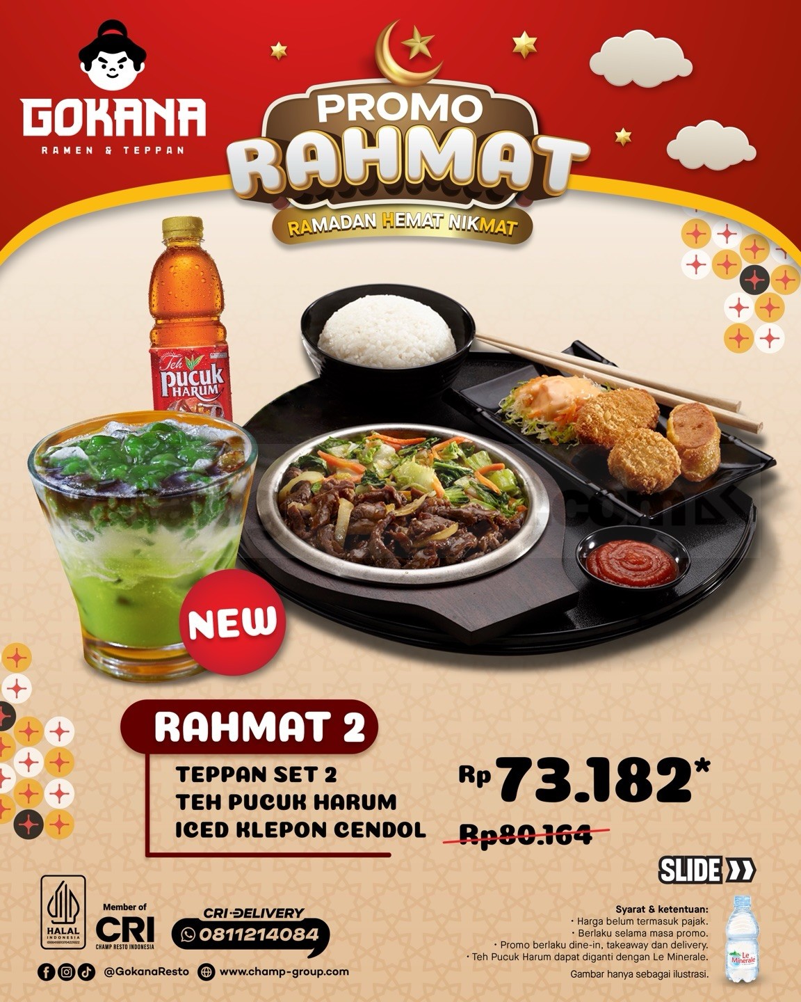 β’ RAHMAT 2 seharga Rp. 73.182* berisi Teppan Set 2, Teh Pucuk Harum, dan Iced Klepon Cendol