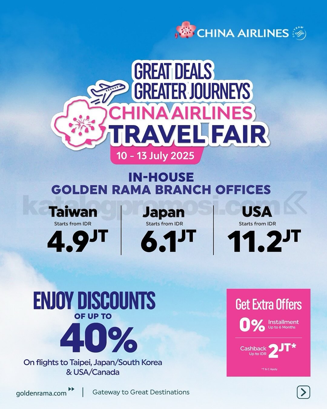 Wujudkan liburan impian kamu dengan promo Golden Rama bersama China Airlines! Nikmati harga spesial mulai IDR 4.9 juta untuk rute ke Taiwan, Japan, Korea, Canada, dan USA. Dapatkan potongan harga hingga 40% untuk penerbangan ke Taipei, Jepang/Korea Selatan, dan USA/Kanada. Promo ini berlaku mulai tanggal 10 sampai 13 Juli 2025 di seluruh kantor cabang Golden Rama.