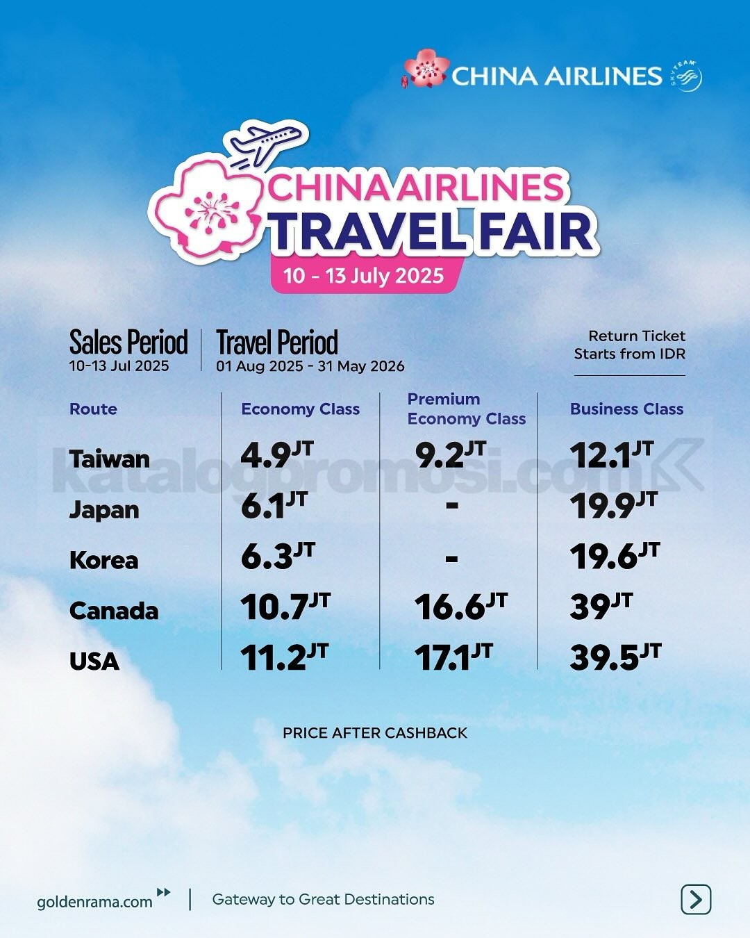 Promo Golden Rama China Airlines diskon hingga 40% untuk penerbangan ke berbagai destinasi dengan harga mulai dari IDR 4.9 juta berlaku mulai tanggal 10 – 13 Juli 2025 di seluruh kantor cabang Golden Rama.