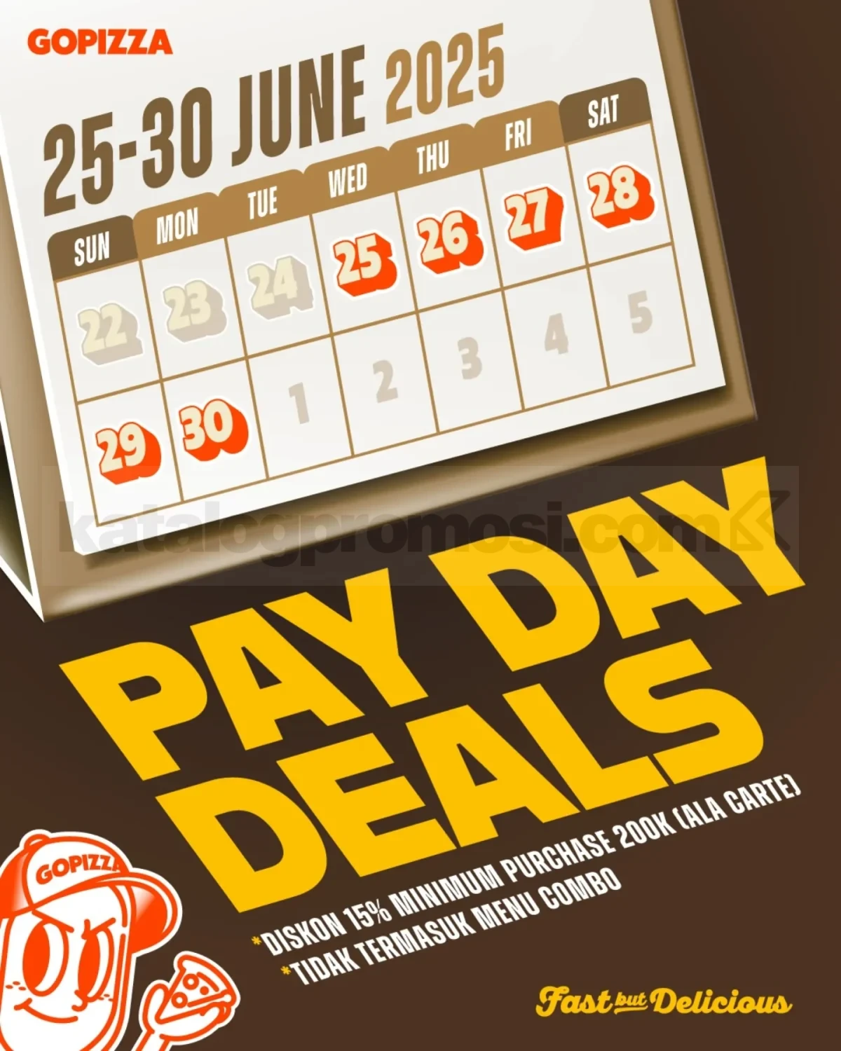 Promo Payday Deals GOPIZZA Diskon 15% untuk pembelian menu ala carte minimal 200K. Promo berlaku tanggal 25–30 Juni 2025.
