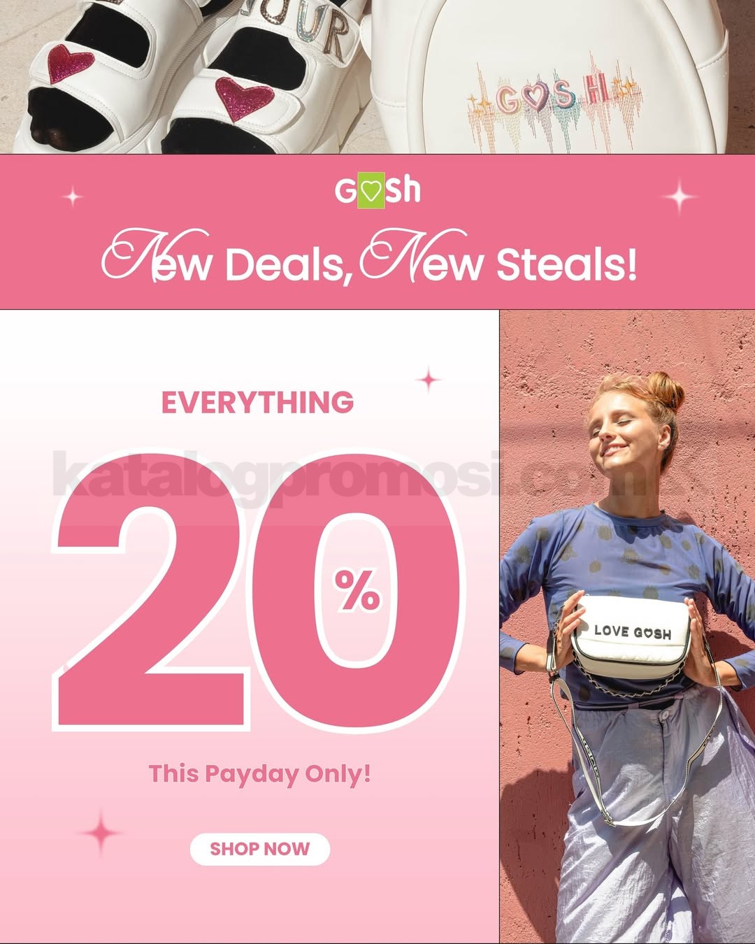 Kalau lagi pengen belanja sepatu atau tas baru, ini waktu yang pas 👟 Promo Gosh Payday Diskon 20% bikin kamu bisa tampil lebih percaya diri tanpa harus keluar budget besar. Yuk langsung mampir ke store terdekat!