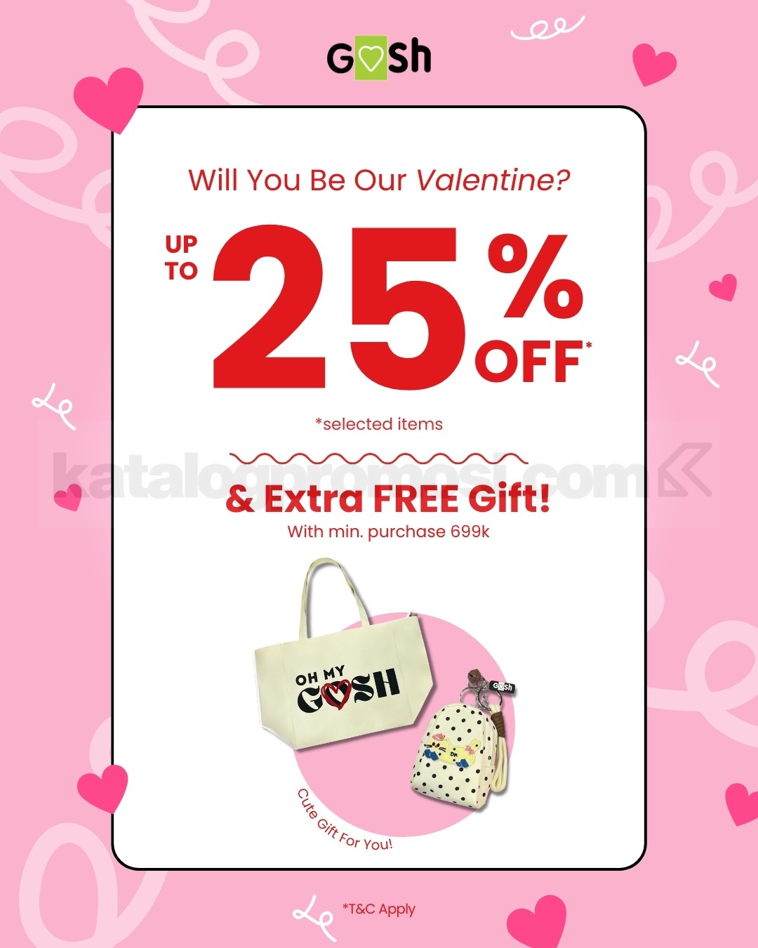 Promo Gosh Shoes Valentine Diskon 25% special gift min. Rp. 699 ribu, belanja item pilihan berlaku selama periode promo di seluruh outlet