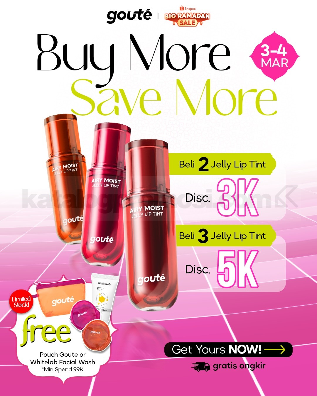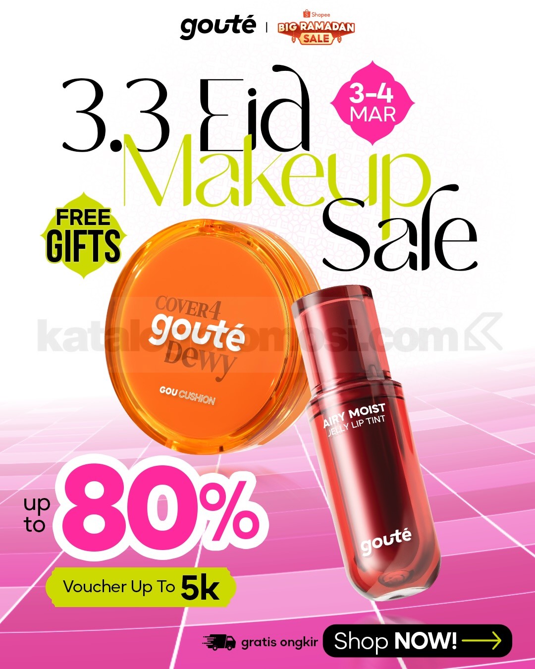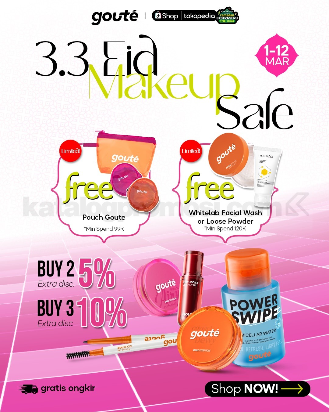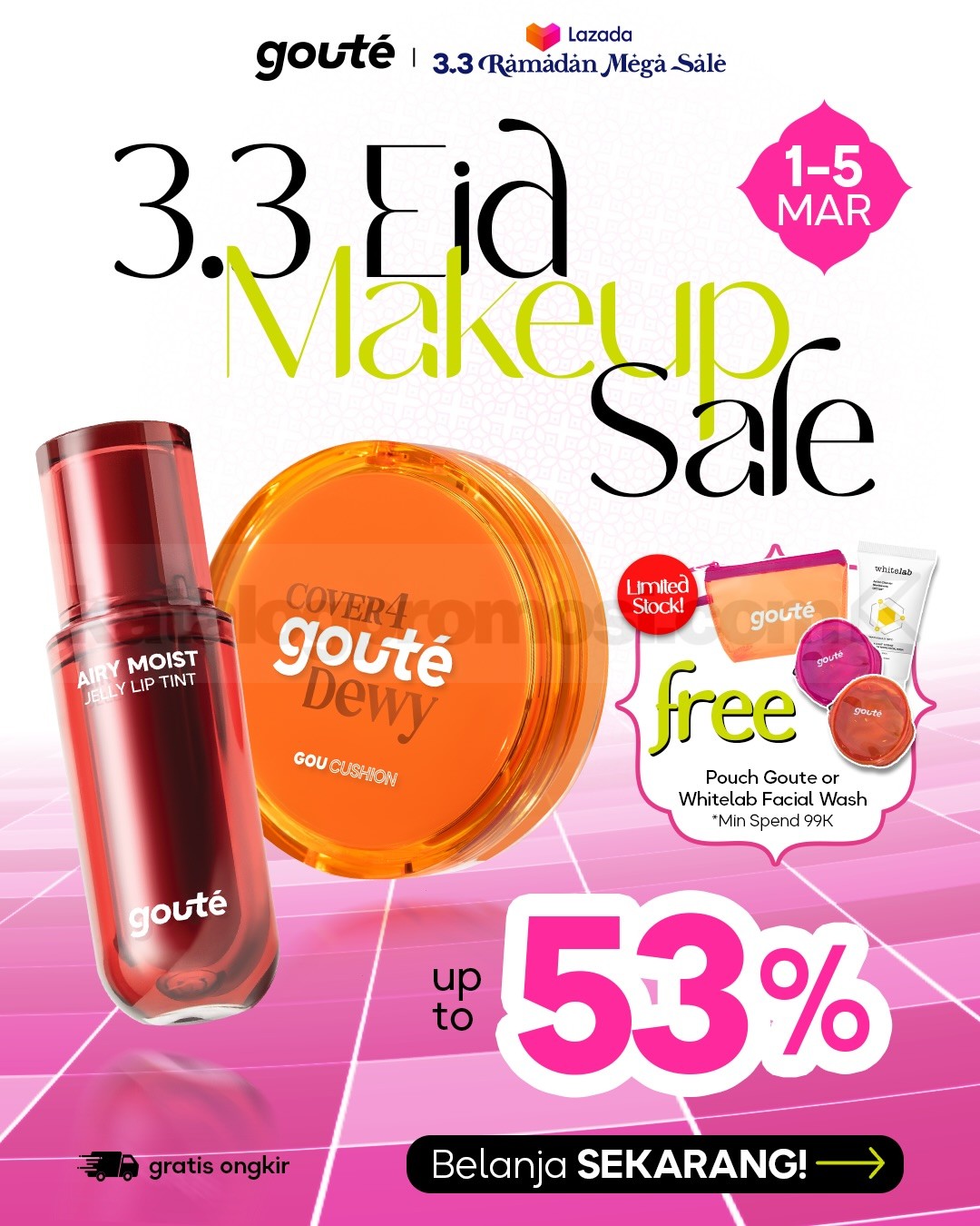 Promo gouté 3.3 Eid Makeup Sale Diskon 80% berlangsung 1 – 12 Maret 2026 di Shopee, Lazada, TikTok Shop, dan Tokopedia dengan diskon hingga 80%, Buy More Save More, FREE gifts min. belanja Rp. 99.000 serta GRATIS ongkir sesuai platform.