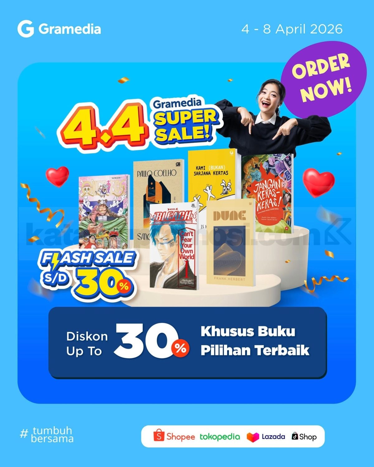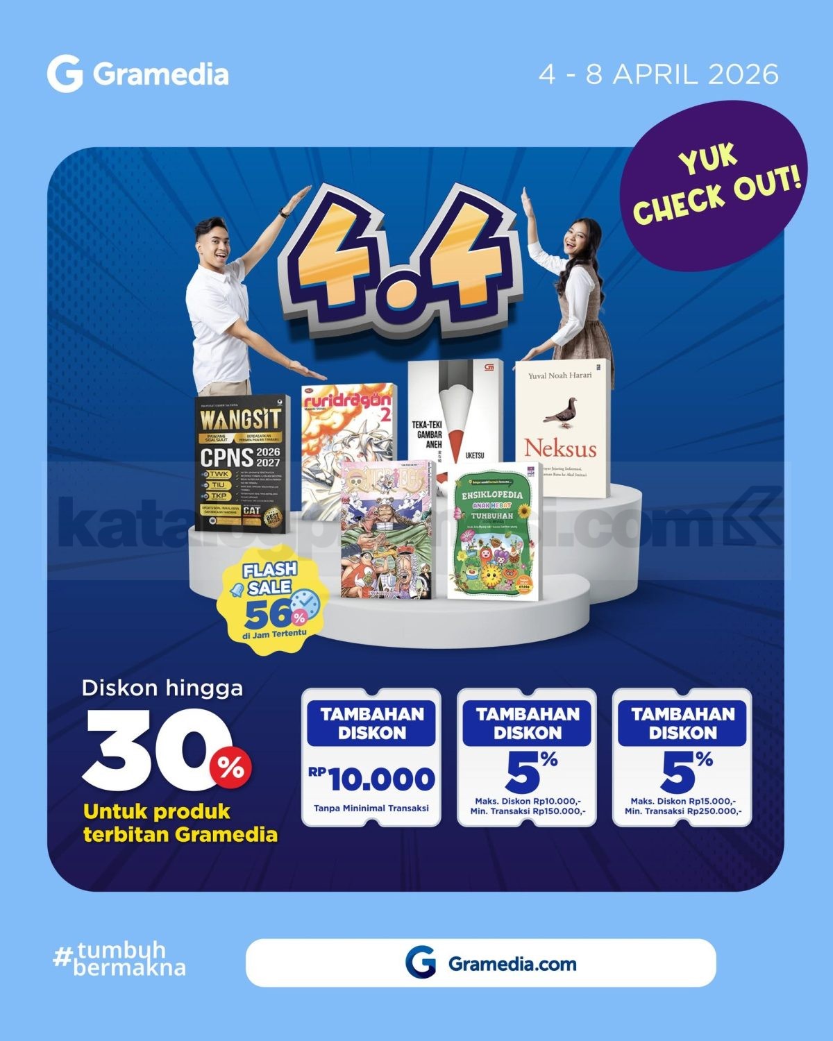 Promo Gramedia 4.4 Diskon Buku hingga 56% periode 4 – 8 April 2026 untuk pembelian melalui website Gramedia.com dan marketplace official Gramedia dengan diskon hingga 30% dan flash sale hingga 56%.