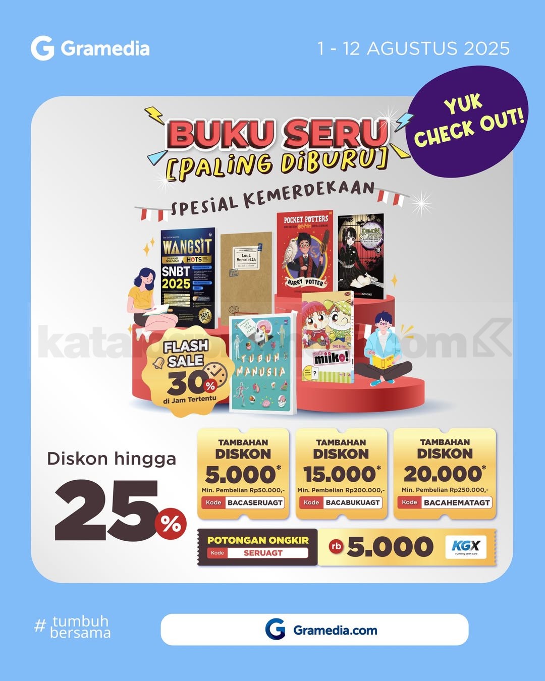 Lagi cari promo seru buat nambah koleksi buku? 📚 Gramedia lagi punya promo Buku Seru Paling Diburu nih! Kamu bisa dapetin diskon sampai 25%, plus flash sale 30% di jam-jam tertentu yang bikin belanja makin seru, dan yang paling bikin happy: ongkir Rp0! 🤩