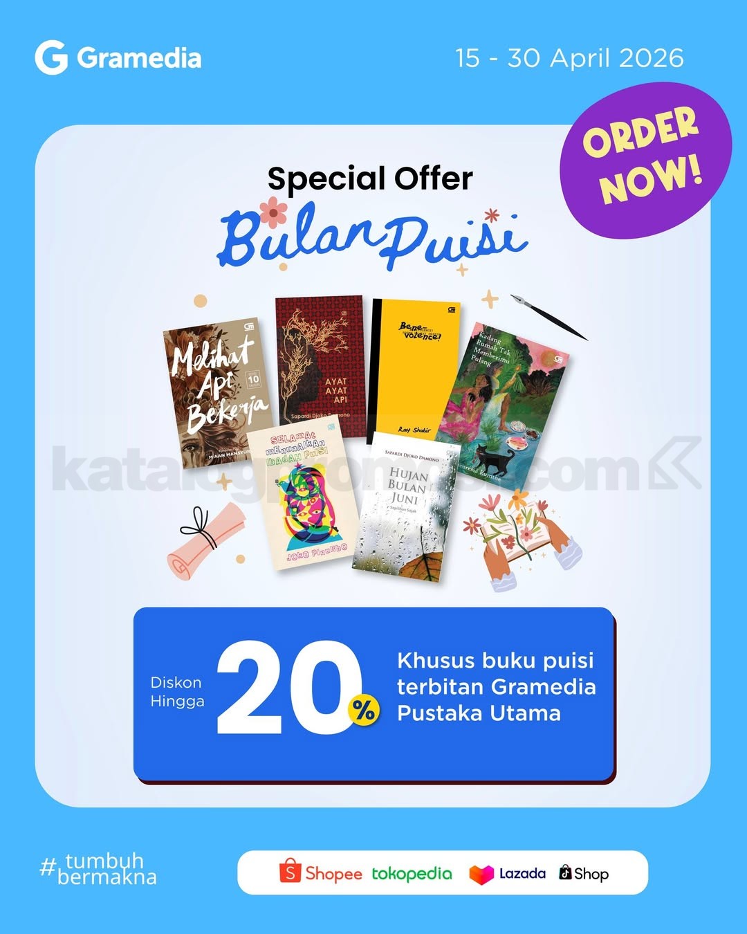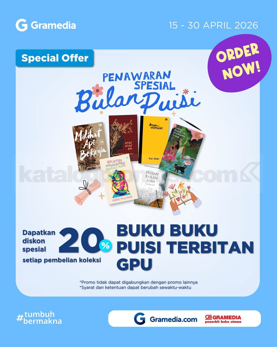 Promo Gramedia Bulan Puisi Diskon 20% nikmati koleksi buku puisi GPU dengan potongan harga, berlaku mulai tanggal 15 April 2026 – 30 April 2026.