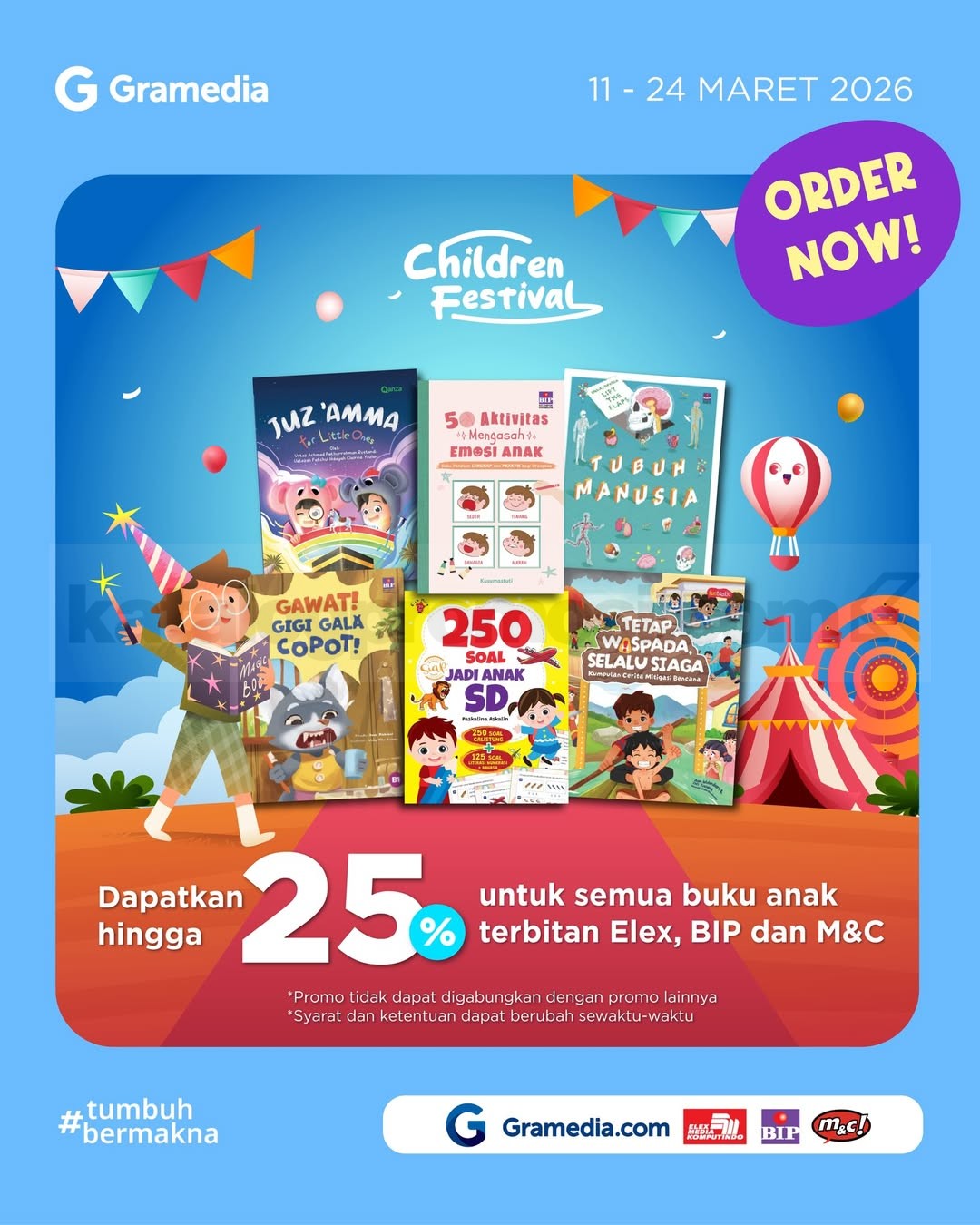 Promo Gramedia Children Festival Buku Anak Diskon 25% untuk terbitan Elex Media, BIP, dan M&C di Gramedia.com berlaku mulai tanggal 11 Maret 2026 – 24 Maret 2026.