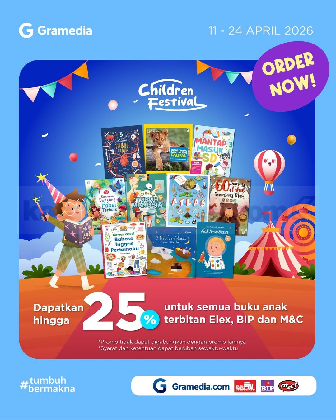 Promo Gramedia Children Festival Diskon 25% Buku Anak bantu tumbuh kembang si kecil lewat buku seru berlaku 11 April 2026 – 24 April 2026