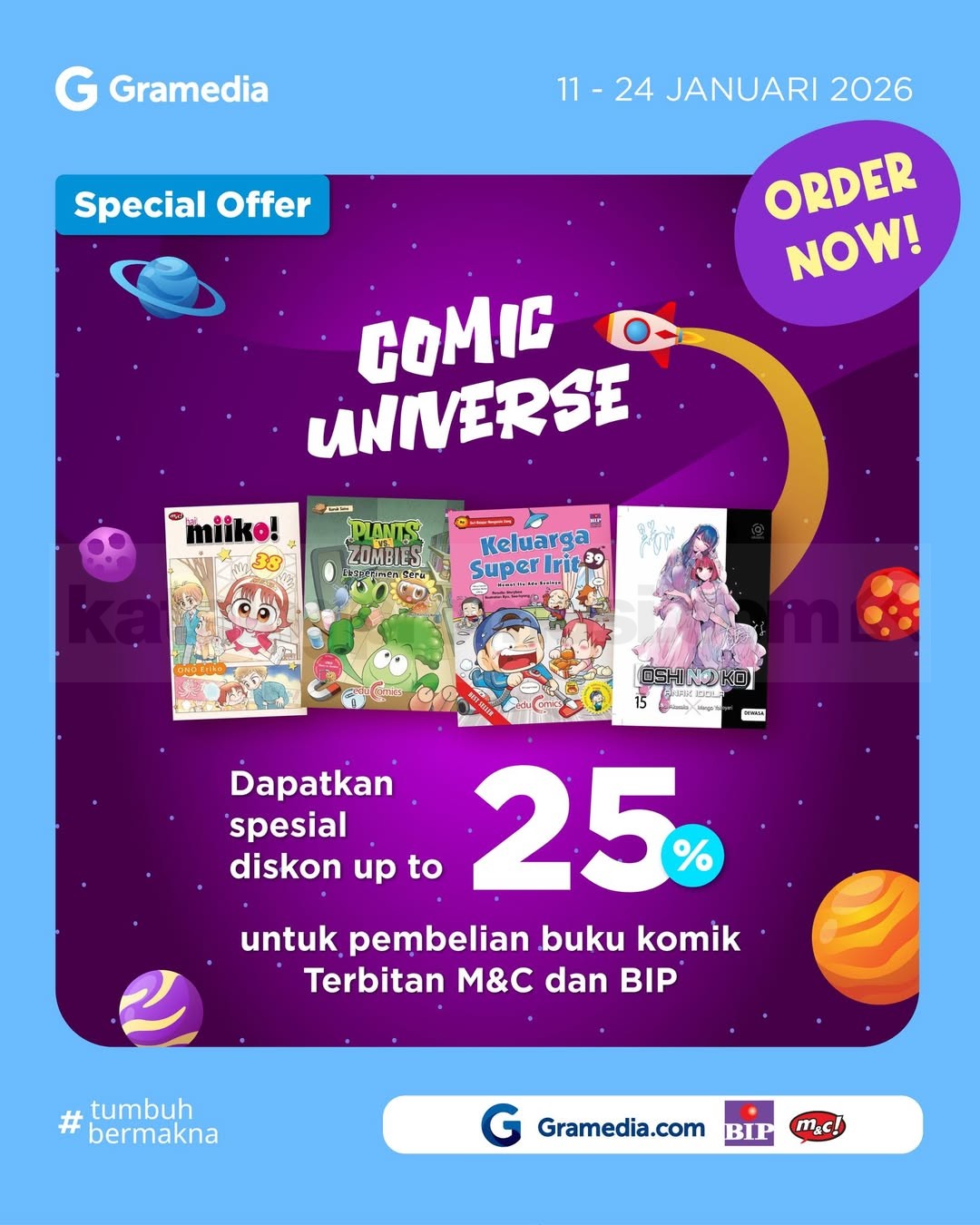 Promo Gramedia Comic Universe Diskon 25% untuk komik M&C dan BIP dengan pembelian online berlaku mulai tanggal 11 Januari 2026 – 24 Januari 2026 di Gramedia.com dan marketplace.