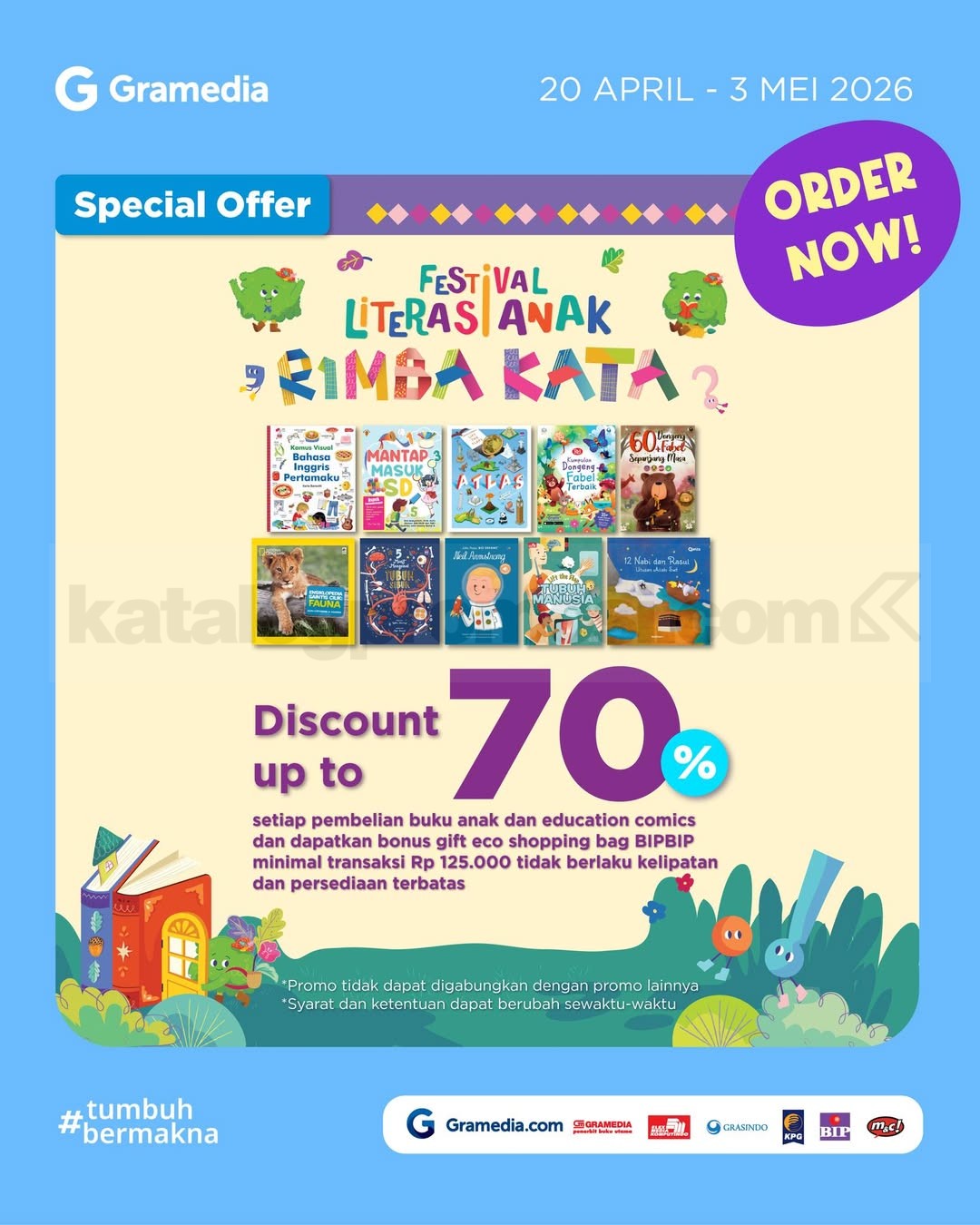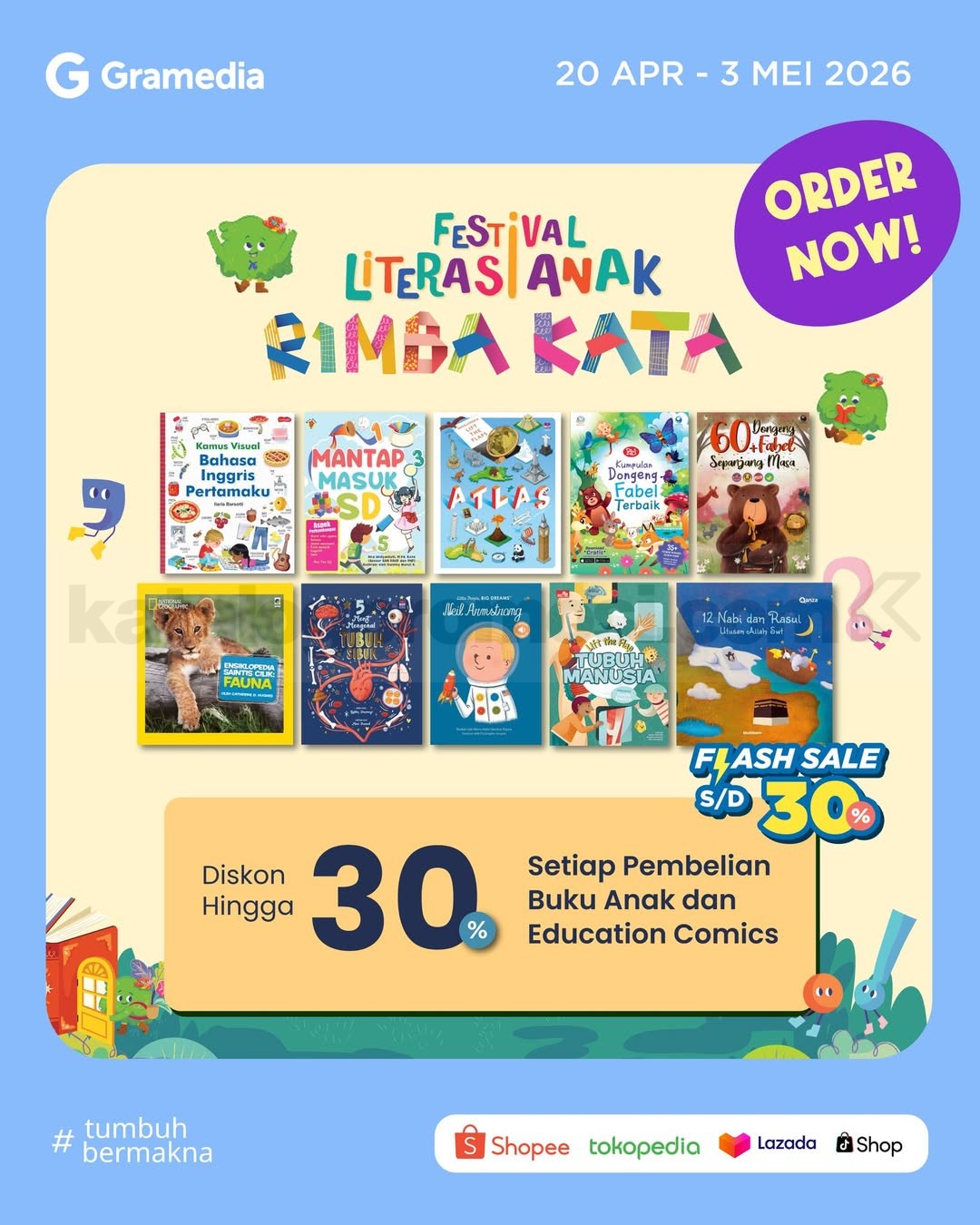 Promo Gramedia Literasi Anak Diskon hingga 70% diskon buku anak Gramedia.com hingga 70% marketplace 30% flash sale 30% berlaku 20 April 2026 – 3 Mei 2026.