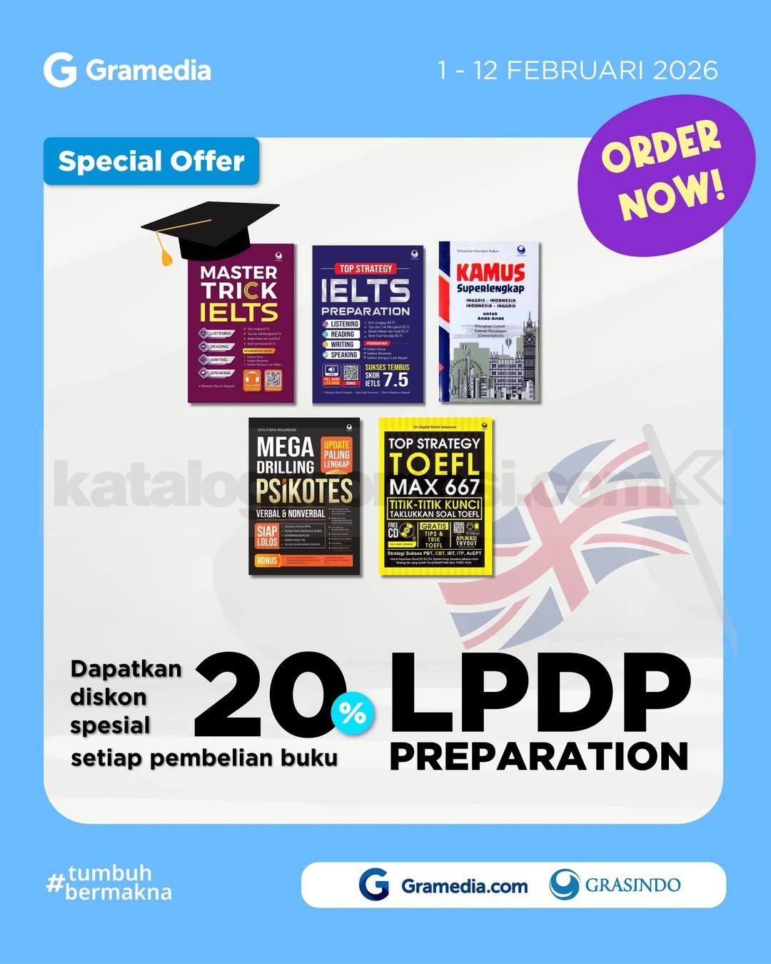 Promo Gramedia LPDP Preparation diskon hingga 20% bantu persiapan IELTS, TOEFL, psikotes, dan seleksi LPDP berlaku mulai tanggal 1 Februari 2026 – 12 Februari 2026